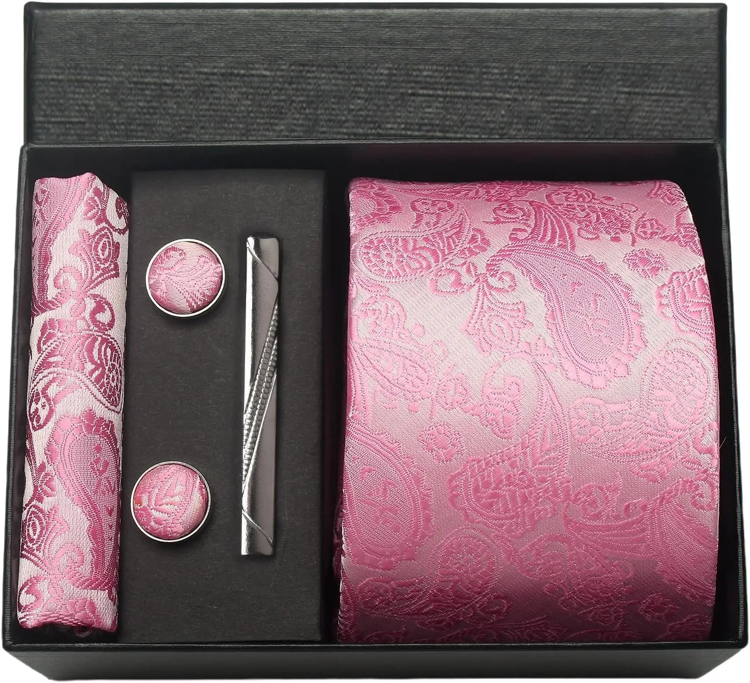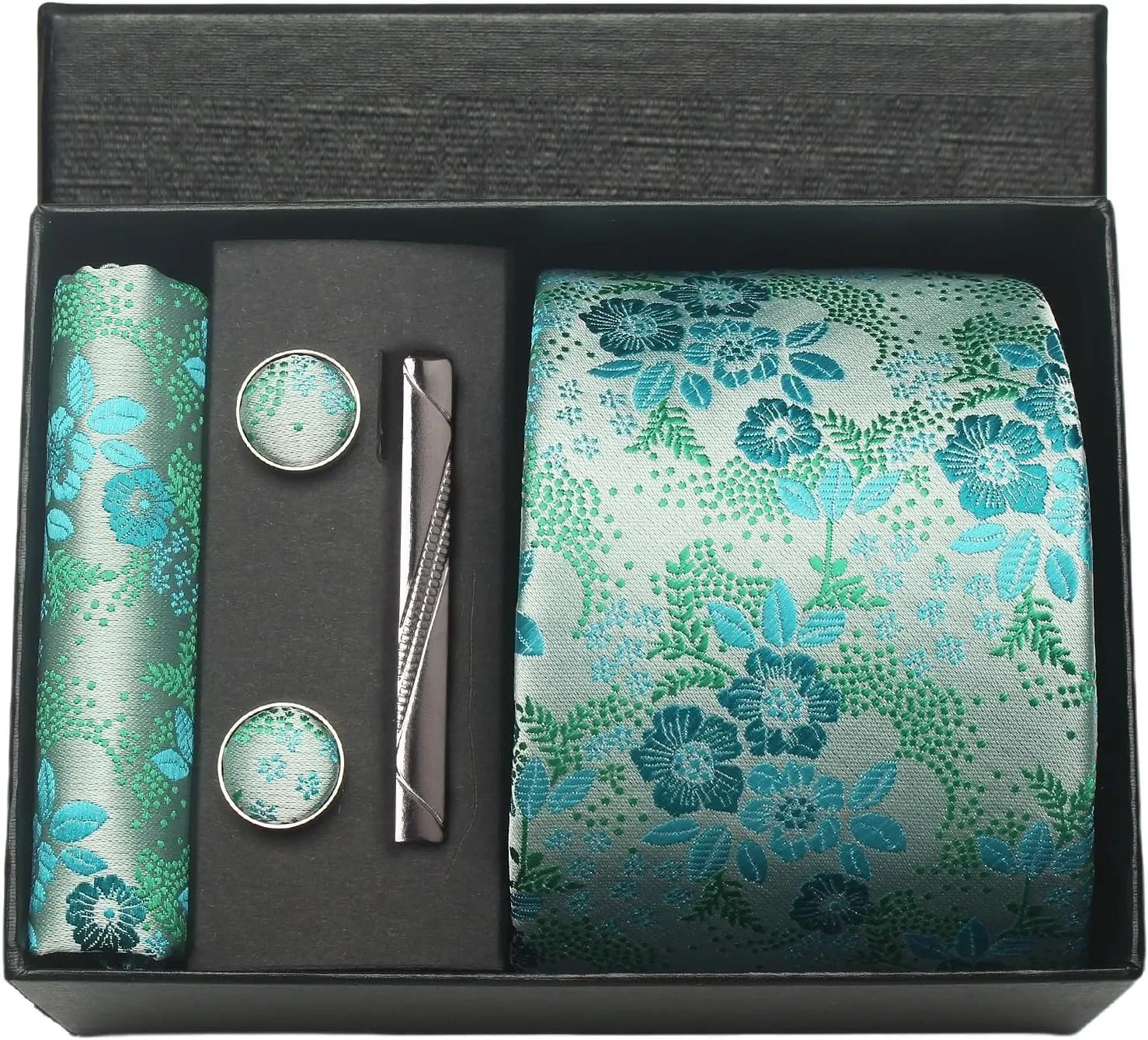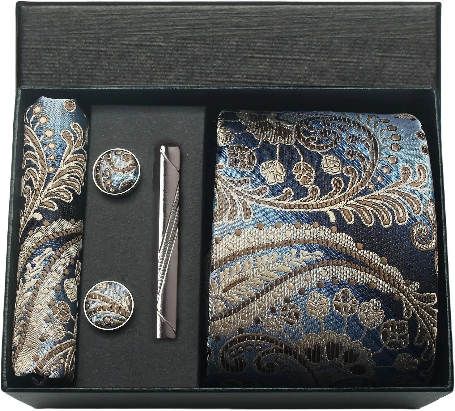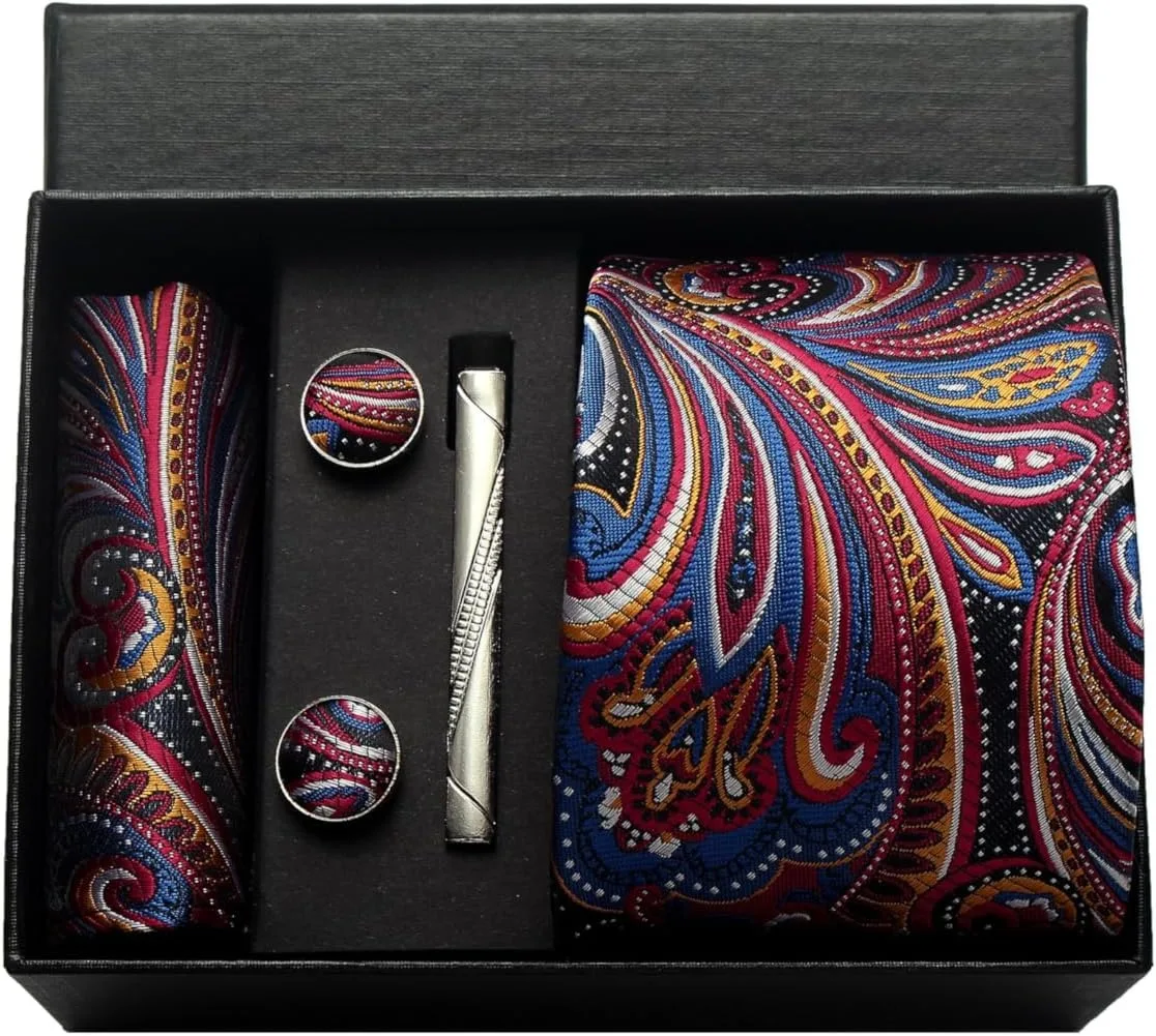 (inclure 1 cravate, 2 boutons de manchette, 1 squre de poche, 1 coffret cadeau et 1 pince à cravate)