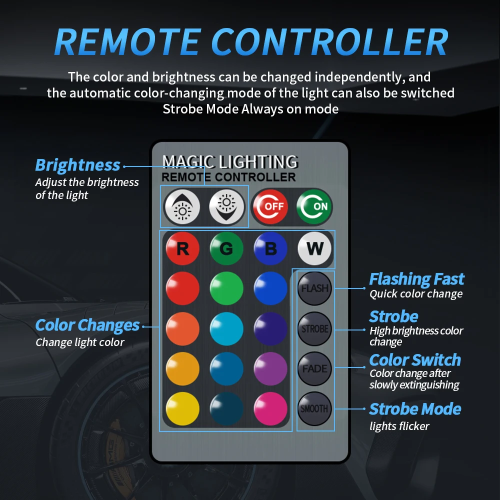 【CARACTÉRISTIQUES】16 couleurs (rouge, vert, bleu, blanc, ambre, etc.) et 5 modes (ordinaire, flash, stroboscopique, fondu et lisse) sont libres de changer par télécommande.