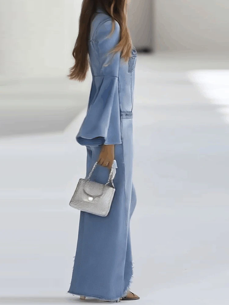 2025 ample couleur unie Denim Style combinaisons femmes simple boutonnage décontracté automne hiver manches évasées col rabattu combishorts