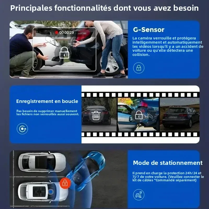 Lorsqu'une personne s'approche de votre voiture ou véhicule, l'appareil s'allume et commence automatiquement l'enregistrement. En cas d'impact ou de collision détecté, l'appareil enregistre automatiquement pendant quelques secondes, assurant une surveillance du stationnement 24h/24.