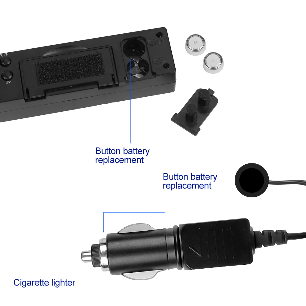 Remarque : si vous avez besoin d'en acheter plusieurs, veuillez nous contacter, nous pouvons vous donner le lien de paiement et vous offrir une remise importante Caractéristique : Multifonction 4 en 1. Intégré Horloge numérique et jauge de température, le conducteur peut apprendre l'heure et température facilement pour organiser le temps de conduite de manière appropriée. Grand écran LCD, vous pouvez afficher clairement l'heure, la date et la seconde, les effets visuels en un coup d'œil. Avec la lumière bleue, vous pouvez facilement apprendre l'heure actuelle la nuit en un seul clic. Il peut être installé et utilisé facilement dans la voiture et au bureau. 1. Affichage de la température intérieure et extérieure, plage de mesure: intérieur: 50-70℃,extérieur:-50℃--70℃ 2. La lampe d'alarme de glace s'allumera à mesure que la température est inférieure à -1℃. 3. Inspectez et affichez la tension de la batterie de stockage automobile en temps réel. Affichage au format 42/24 heures. 5Fonction de tendance à la température. 6Inspectez et affichez en temps réel 7 tension de la batterie de stockage automobile. 8. Le rétroéclairage orange et bleu peut être déplacé. 10、 Prise de source électrique de voiture 11、 Support de conversion 12. Ruban magique à l'arrière Spécification : Couleur : noir Matériel: ABS Quantité: 1 pièce Batterie : 1xCR2032 (incluse) Taille : comme le montre l'image. Fonction : horloge, thermomètre, testeur de tension. Réglage de l'heure : Dans l'état normal de l'heure, maintenez enfoncé le bouton TIME pendant 3 secondes, puis 12 heures ou 24 heures clignotent, indiquant que l'état de réglage de l'heure est entré. ce moment, appuyez sur le bouton HAUT ou BAS pour sélectionner le système d'affichage 12 ou 24 heures. cette fois, appuyez sur la touche TIME pour définir respectivement les éléments suivants : 12/24 heures --- secondes --- heures-minutes-année --- mois-période----confirmer sortie. Appuyez sur la touche HAUT ou DOWN pour augmenter ou diminuer l'élément respectivement. Dans l'état d'heure normal, appuyez une fois sur le bouton TIME pour passer à l'état d'affichage du mois et de la date. Appuyez sur le C/ Touche F pour basculer entre Celsius et Fahrenheit