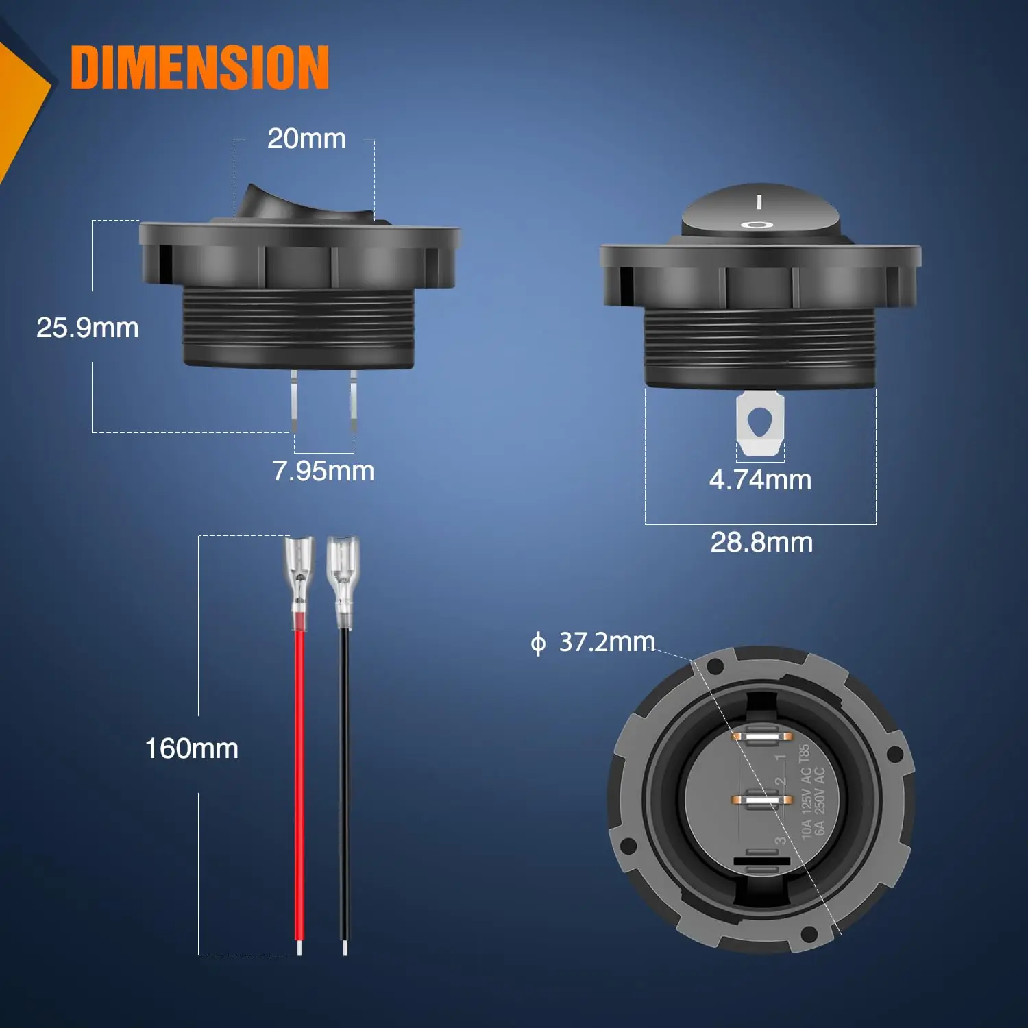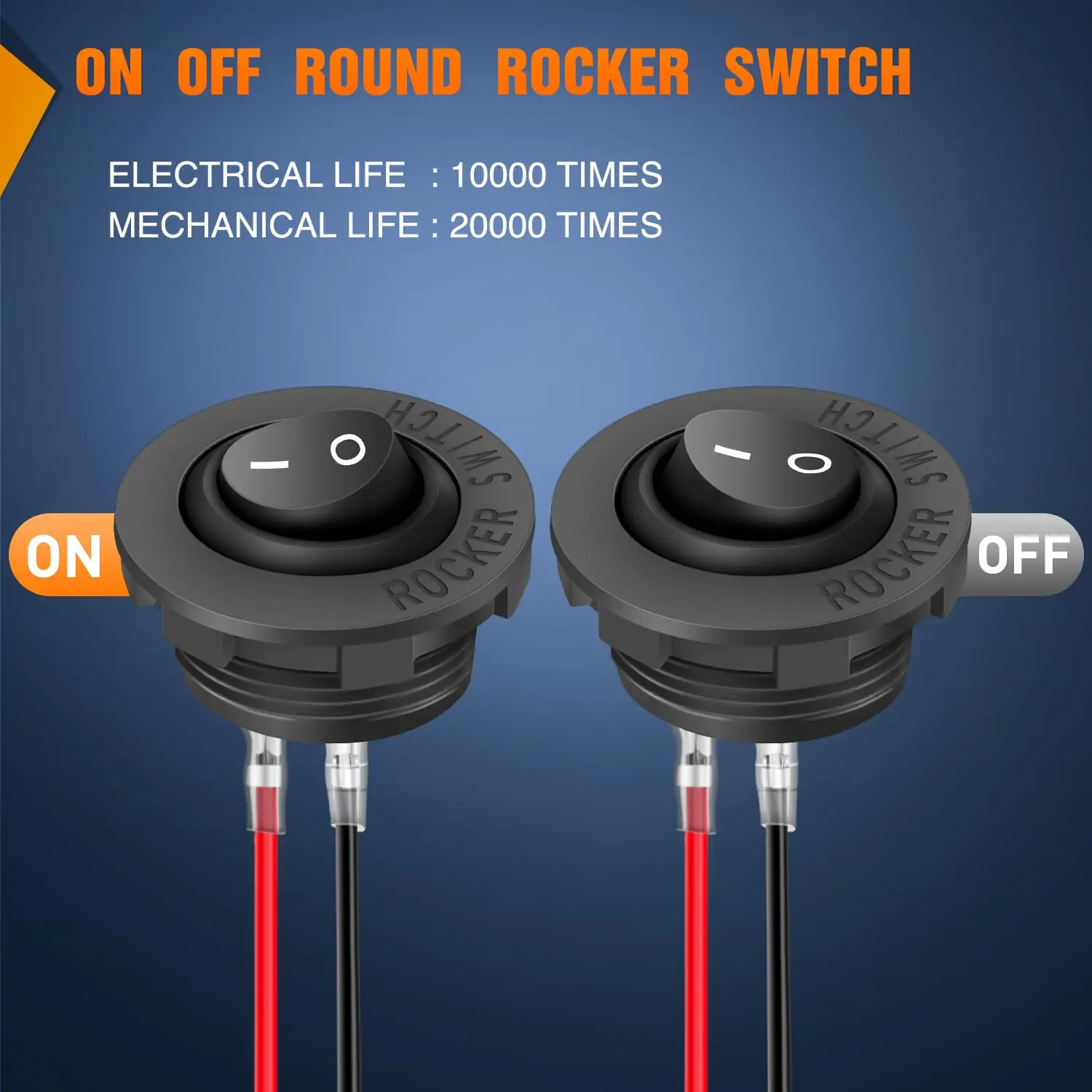 Interrupteur ON OFF : l'interrupteur rond est doté d'une conception SPST ON OFF à 2 broches (unipolaire à jet unique), avec un indice de 10 A 125 V CA et 20 A 12 V CC.La durée de vie peut atteindre 500 000 cycles, durable et antirouille.