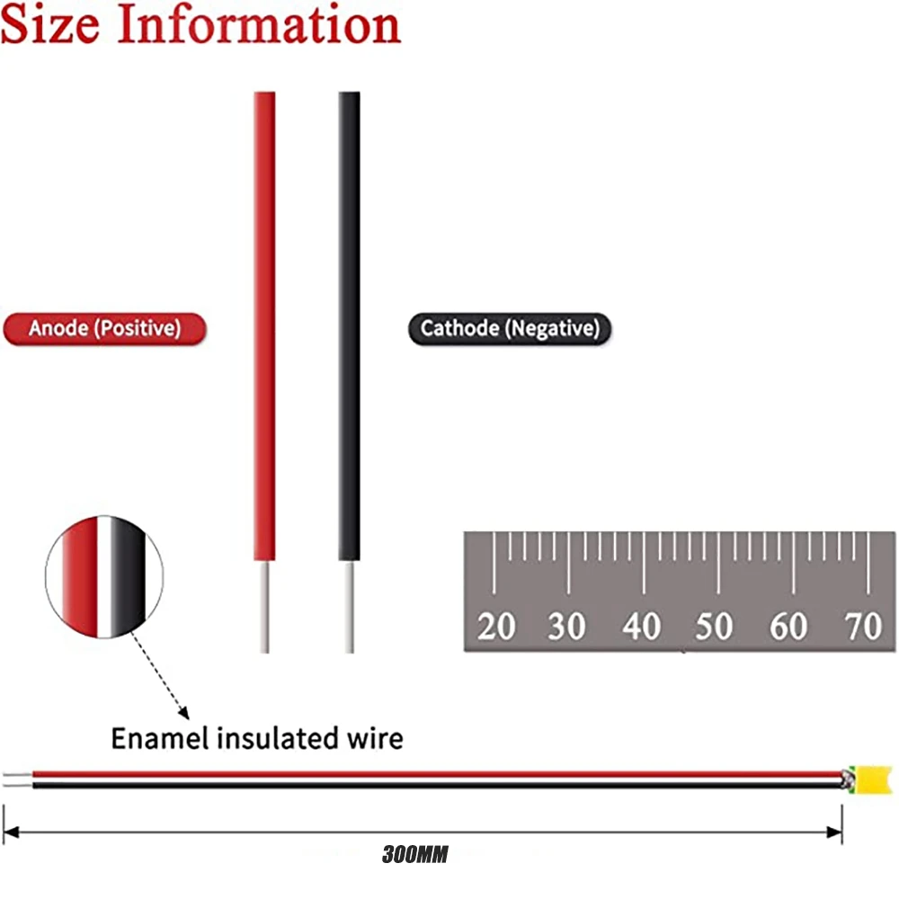La longueur du fil est d'environ 300 mm.Pour une connexion facilement reconnaissable, l'anode est un fil rouge, la cathode est bleue.