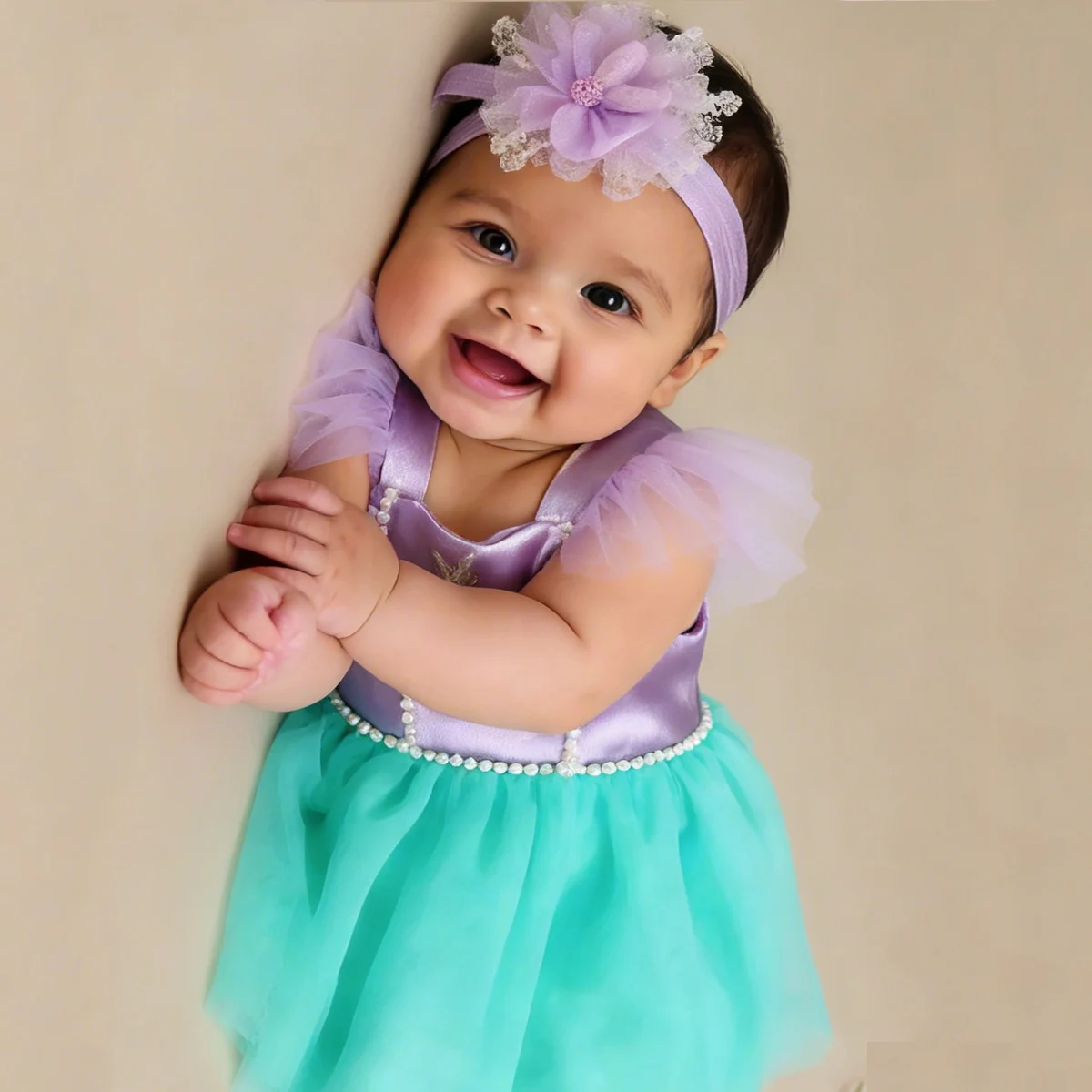 Accessoires de photographie pour nouveau-nés, robe violette style étoile de mer et perle pour bébé fille avec bandeau, tenues de séance photo pour nourrissons