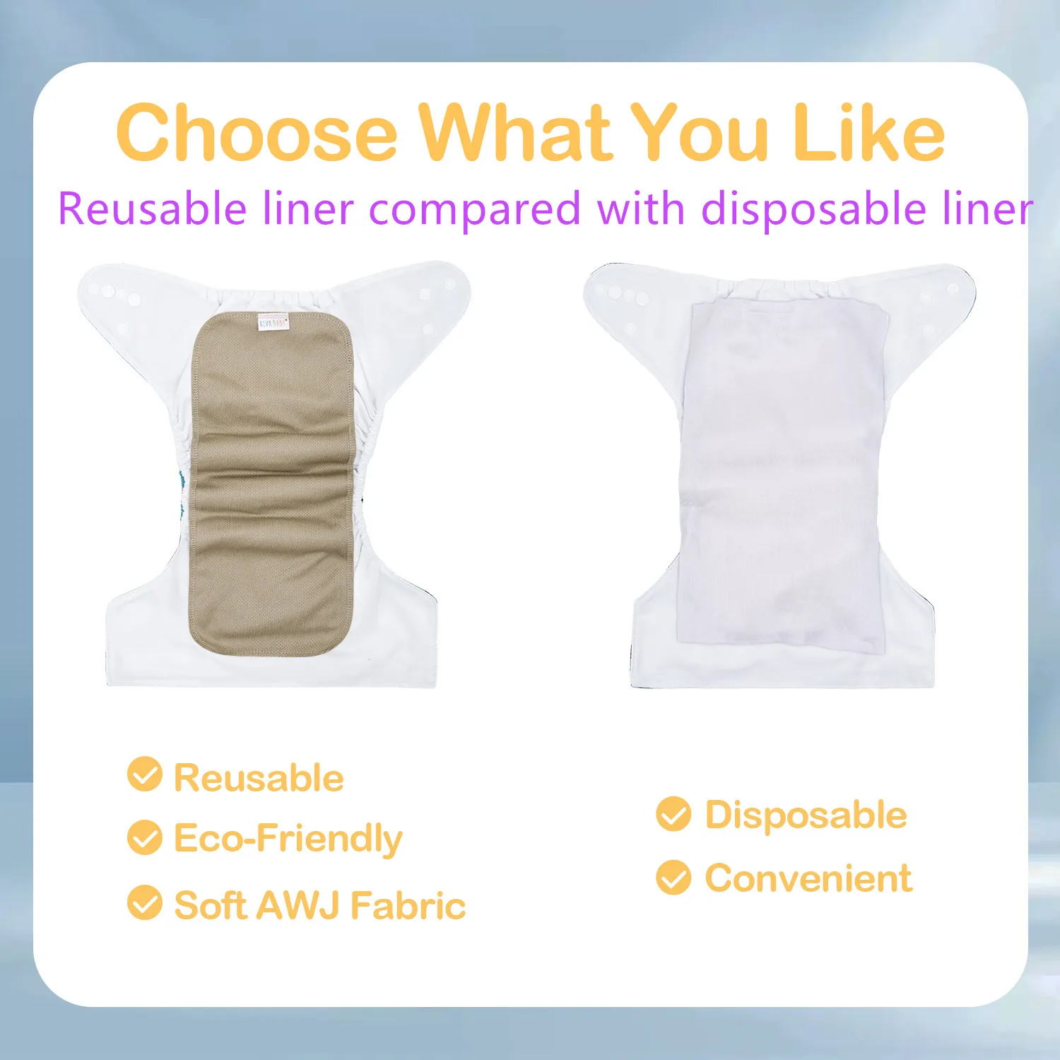 Nos doublures de couches en tissu AWJ réutilisables ALVABABY sont parfaites pour simplifier les changements de couches et la lessive. Fabriquées à partir de jersey mèche athlétique, ces doublures laissent passer les liquides tout en gardant les solides sur le dessus, ce qui facilite le nettoyage. Comprend 10 doublures.