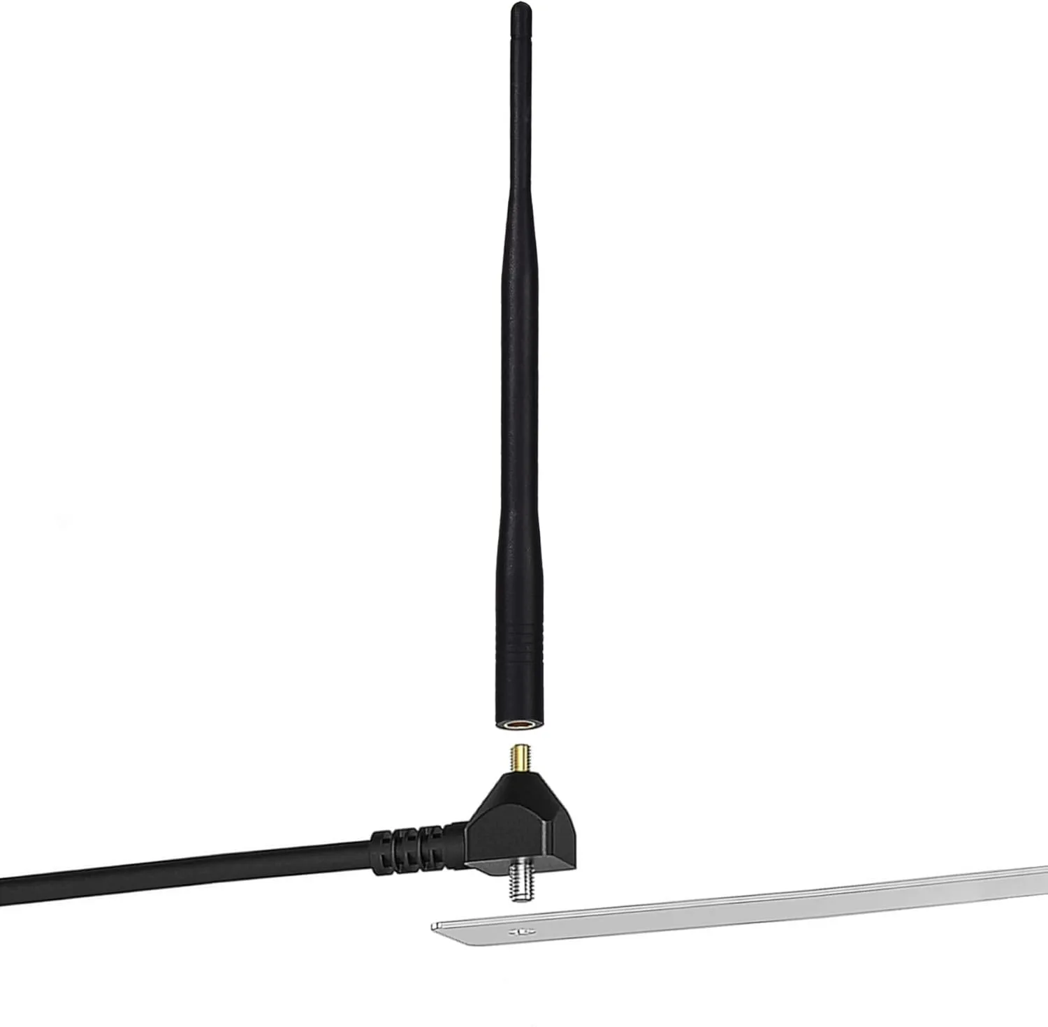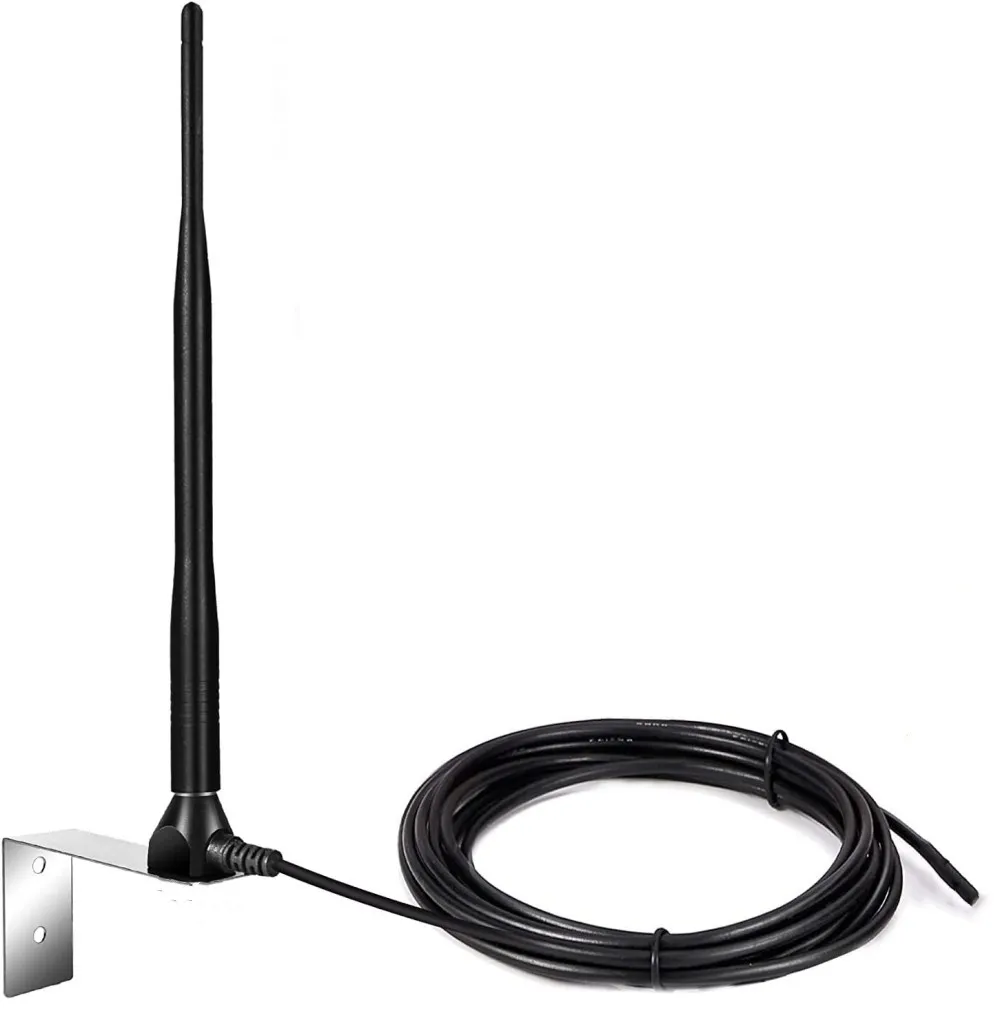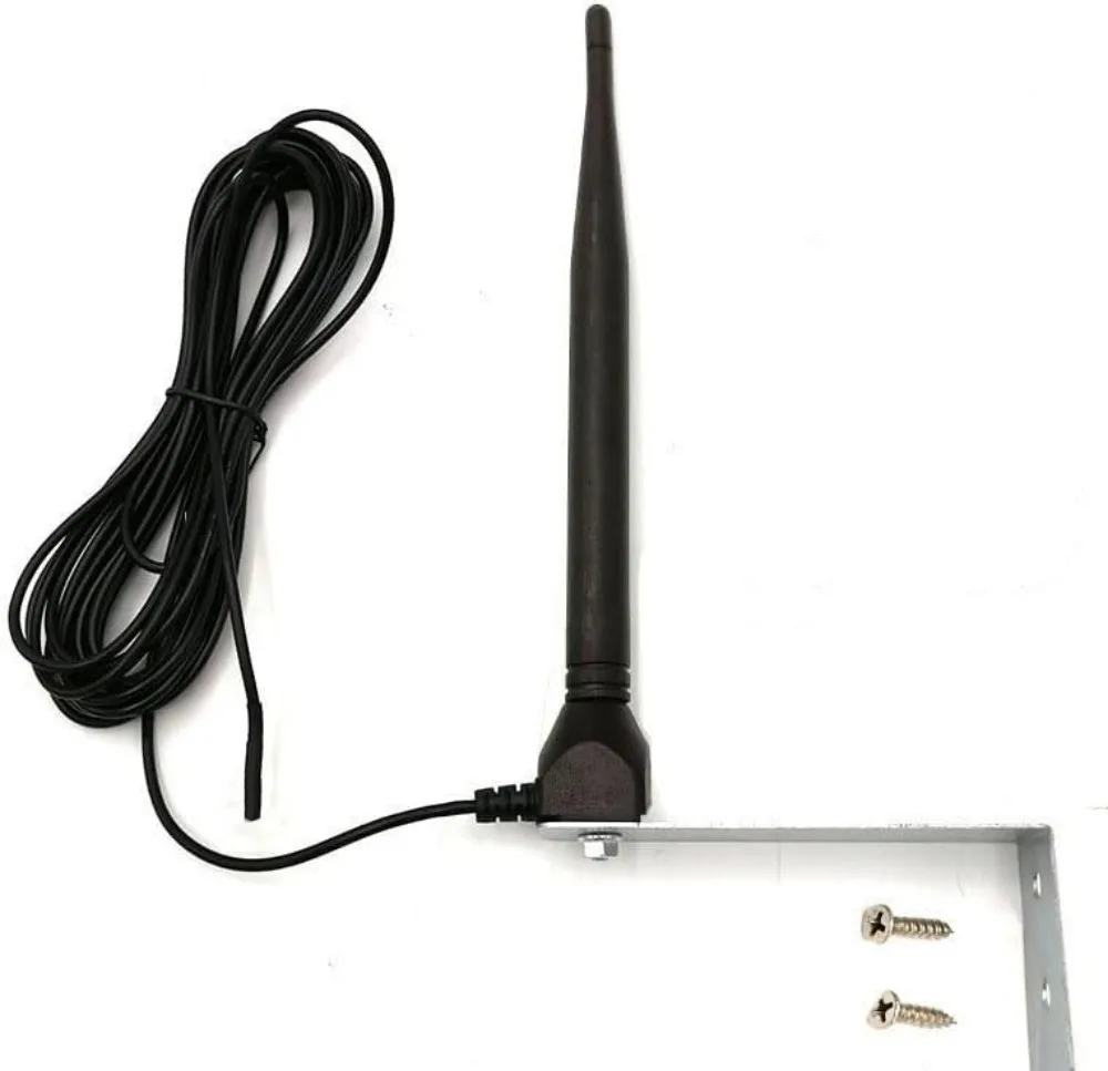 Antenne RG58 antenne externe de porte de garage électrique 433MHZ antenne d'amélioration de signal à distance de garage Spécification 1) Matériel: ABS et métal 2) Couleur: Noir 3) Fréquence: 433.92MHz 433MHz 4) Montage: Vis (montage mural) 5) Longueur de câble (m): 5M 6) Bande passante (MHz): 10 7) VSWR ≤ 2 8) Gain(dBi): 3 1 9) Capacité de puissance (W): 50 10) Impédance d'entrée (Ω): 50 11) Polarisation: Verticale 12) Longueur de l'antenne (mm): 215 13) Type de câble: RG58 14) Support en acier inoxydable S'applique à: Portes de garage, portails électroniques, portails barrières, portes coulissantes, portes automatiques, portes roulantes, volets Appareils électriques/domotique c.-à-d. lumières, système d'alarme, système de contrôle d'accès