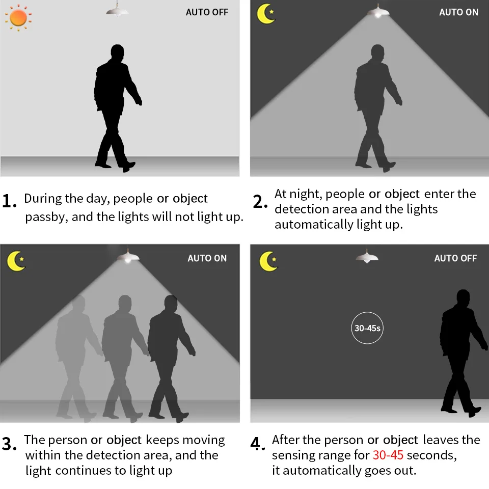2. Ouvrez au crépuscule ou la nuit, détectez tous les objets en mouvement dans une plage de détection de 3 à 6 mètres et allumez la lumière.