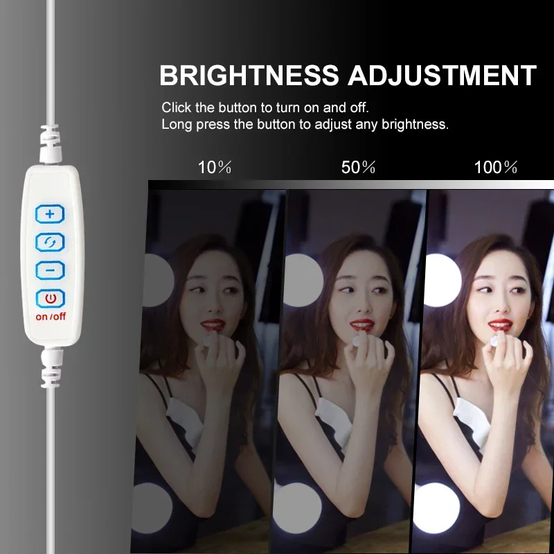 Paramètres : * Nom du produit : Lampe LED pour miroir * Matériau : PC * Tension d'entrée : 5 V * Couleur de la lumière : 3 couleurs 1 lumière * Température de couleur : (3500-5500 K) * Prise : port USB * Taille de l'ampoule : 3,2 cm x 4 cm x 4,8 cm * Nombre d'ampoules : 4 pièces/6 pièces/10 pièces/12 pièces * Intensité réglable : intensité réglable en continu La lampe miroir de maquillage la plus populaire en 2024 Lumière naturelle LED La lampe utilise des perles LED haut de gamme, la lumière est douce et n'éblouit pas Avant et après utilisation Avant utilisation, la lumière est faible et il est difficile de voir le contraste entre la lumière et l'obscurité ; Après utilisation, la lumière est vive et le maquillage est plus délicat. Fonction de réglage de 3 couleurs CONSEIL : seuls les modes 3 couleurs disposent de cette fonction 3 couleurs : lumière froide / lumière naturelle / lumière chaude Lumière froide : adaptée au maquillage en intérieur Lumière naturelle : adaptée au maquillage quotidien Lumière chaude : adaptée au maquillage de soirée Mémoire Fonction de gradation en continu Réglage de la luminosité, la luminosité peut être réglée de sombre à claire selon les besoins. Grâce à la fonction de mémoire, le dernier mode d'éclairage utilisé est enregistré et le même mode d'éclairage est utilisé lors de la prochaine utilisation. Étapes d'installation 1. Faites une marque avant l'installation 2. Décollez le ruban adhésif double face 3. Collez l'ampoule sur le miroir 4. Ajustez le câble de connexion 5. Démontage indépendant de l'ampoule 6. Ajustez l'espacement entre les ampoules