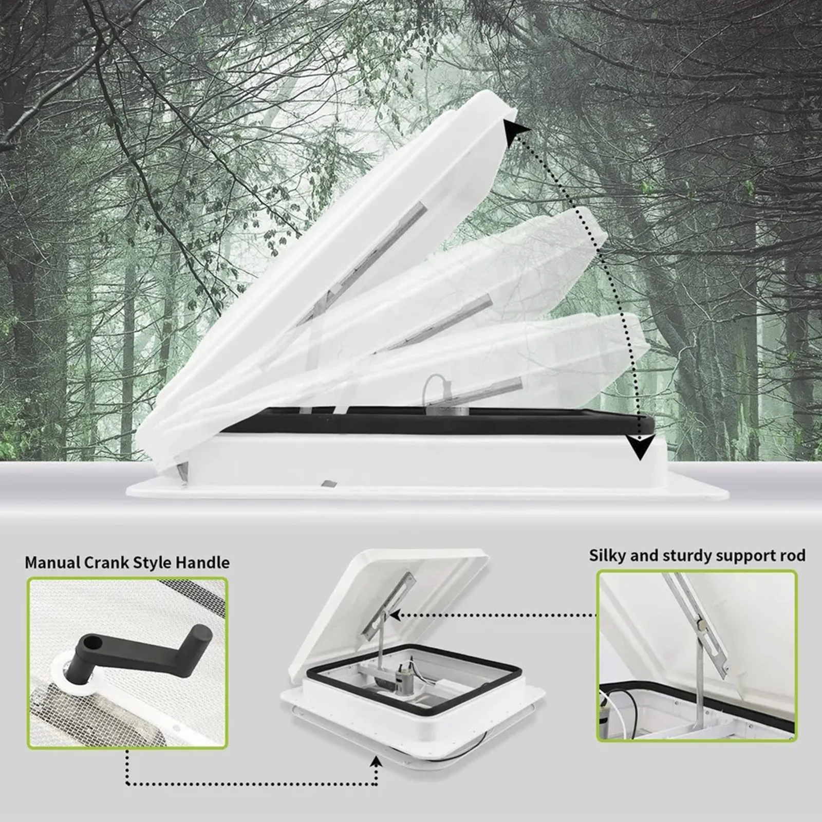 L'évent du toit du camping-car est fabriqué dans un matériau plastique durable, résistant aux UV et imperméable.Le ruban Putty aide à sceller parfaitement le cadre dans le toit de votre camping-car et à empêcher l'eau de pluie de pénétrer.
