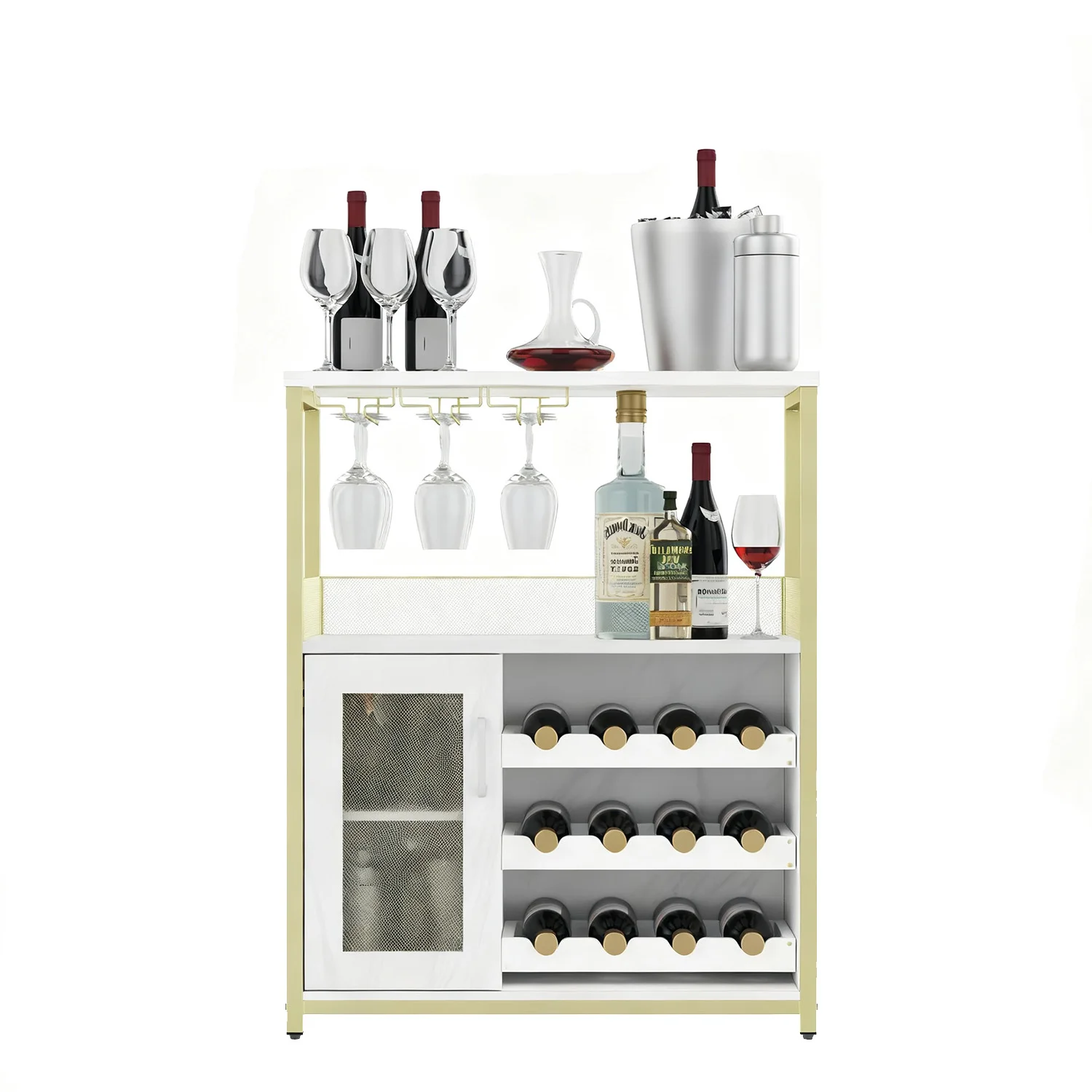 Armoire de Bar à vin à 3 niveaux avec casier à vin amovible et espace de rangement, armoire de Buffet avec support en verre et porte en maille pour la maison