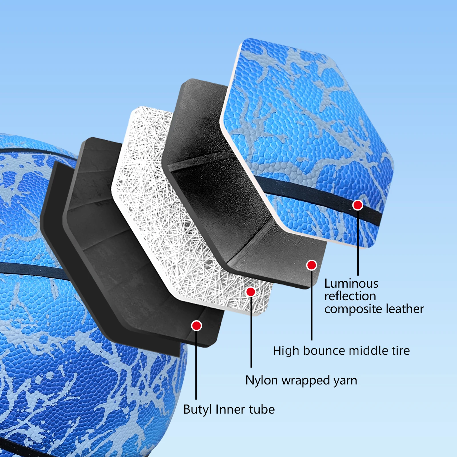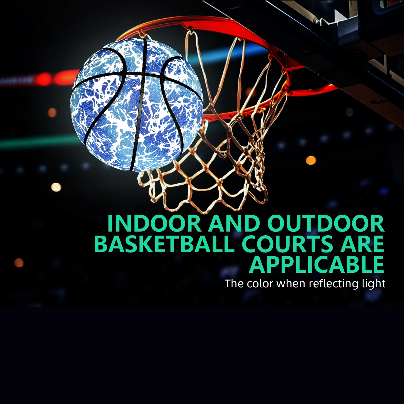 Ballon de basket-ball réfléchissant brillant pour adultes et enfants, résistant à l'usure, lumineux, taille 7/6/5, ballon d'entraînement en cuir souple Pu