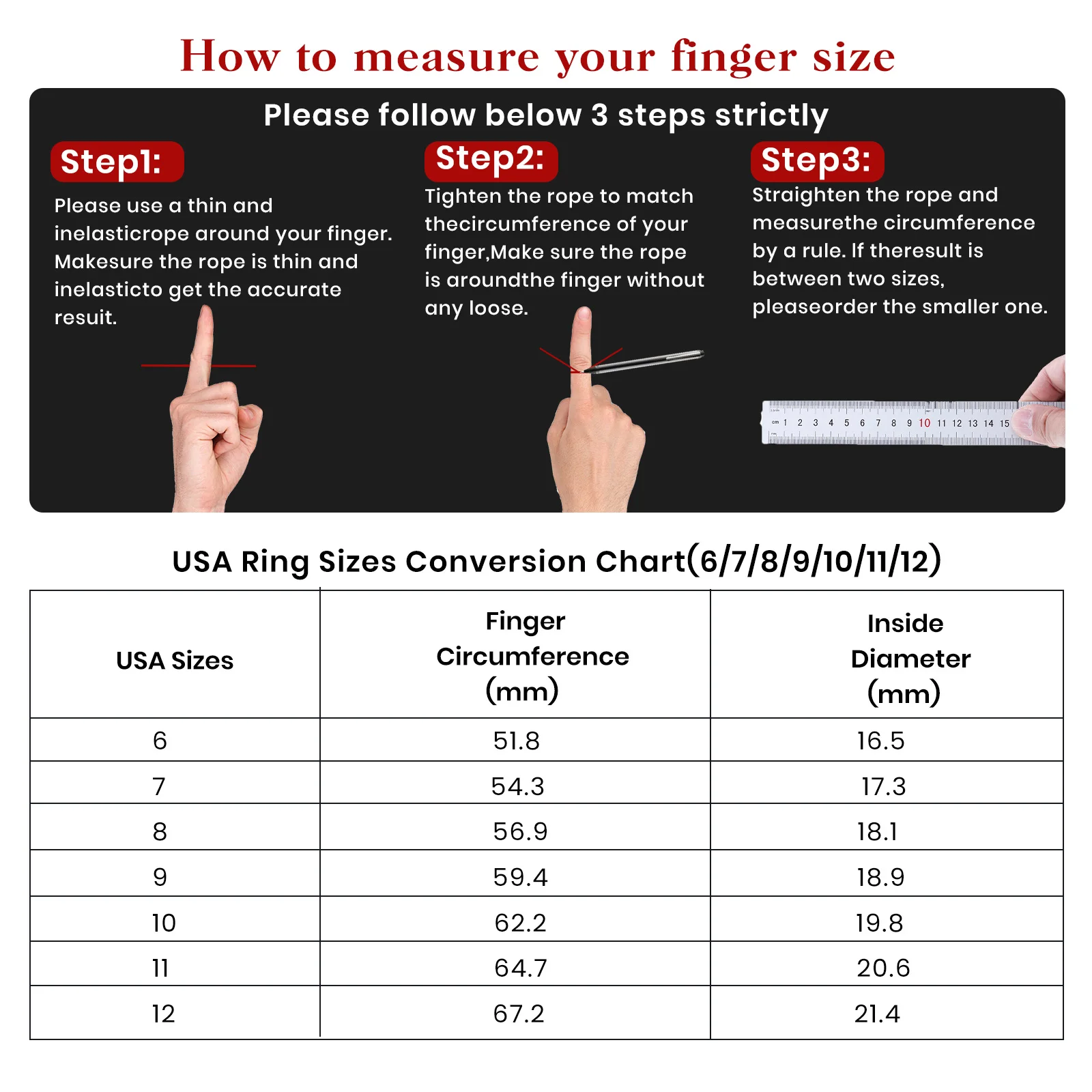 ⚫ Si vous n'êtes pas sûr de votre taille, veuillez consulter un bijoutier local ou suivre strictement nos étapes de mesure.