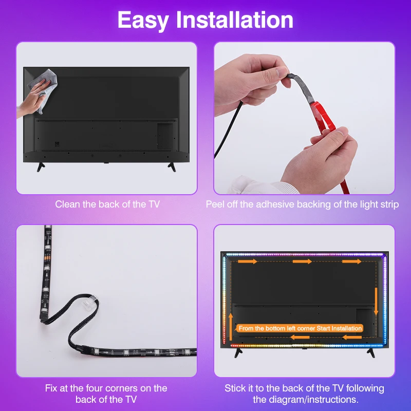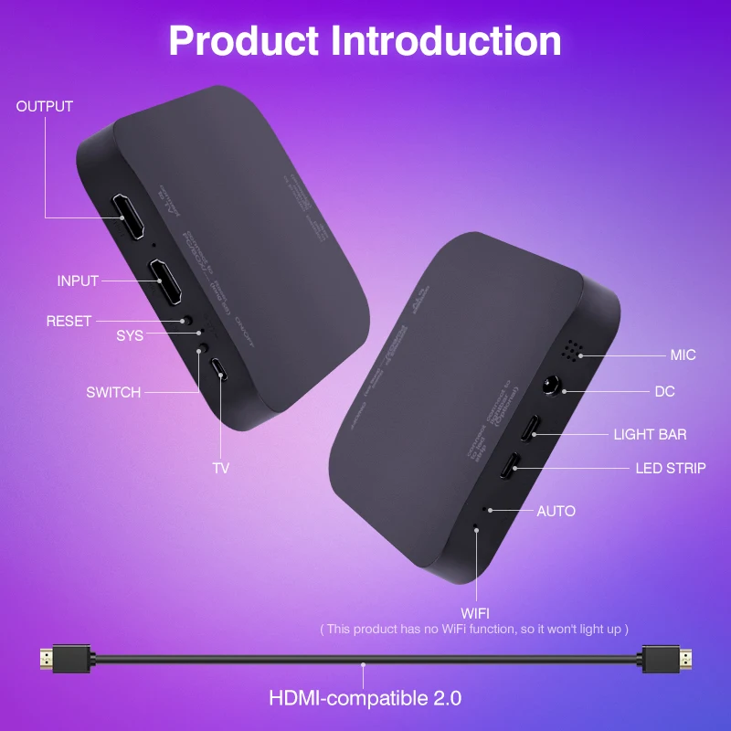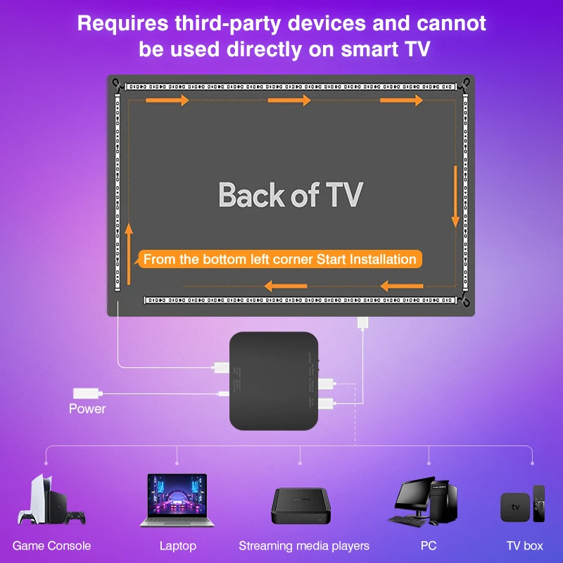 1.Notre bande lumineuse TV est facile à utiliser, plug and play et ne nécessite pas de fonctionnement WiFi ou APP.Cependant, il nécessite un périphérique source de sortie, tel qu'un boîtier TV, une console de jeu, un ordinateur portable, etc.Si vous n'êtes pas sûr que votre appareil source de sortie soit compatible avec notre dispositif de bande lumineuse, veuillez contacter notre service client en ligne avant d'acheter et nous vous répondrons dans les 24 heures.