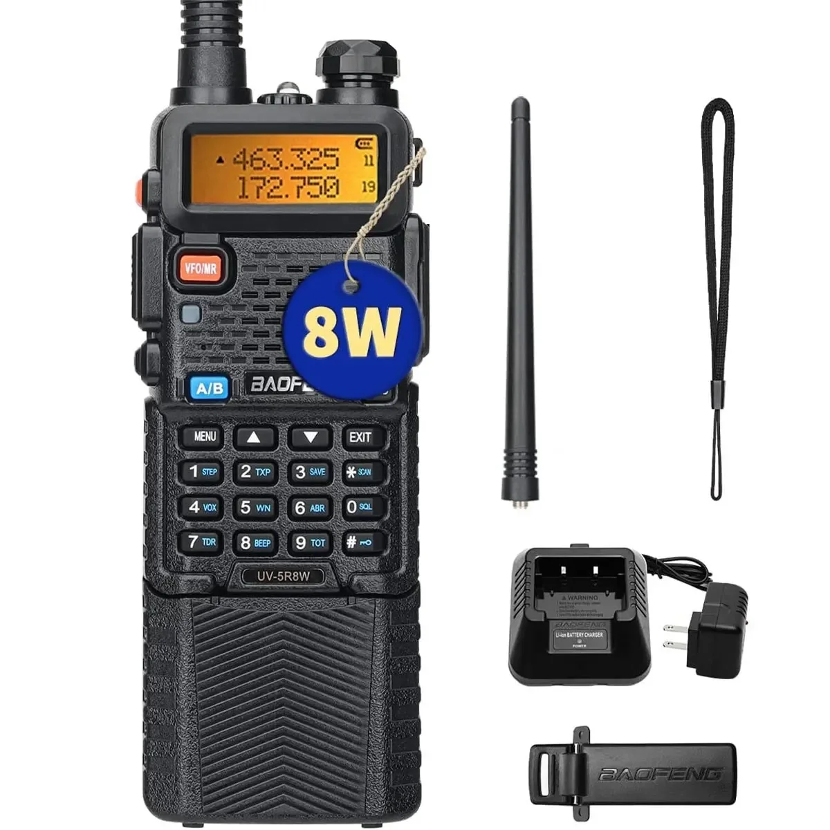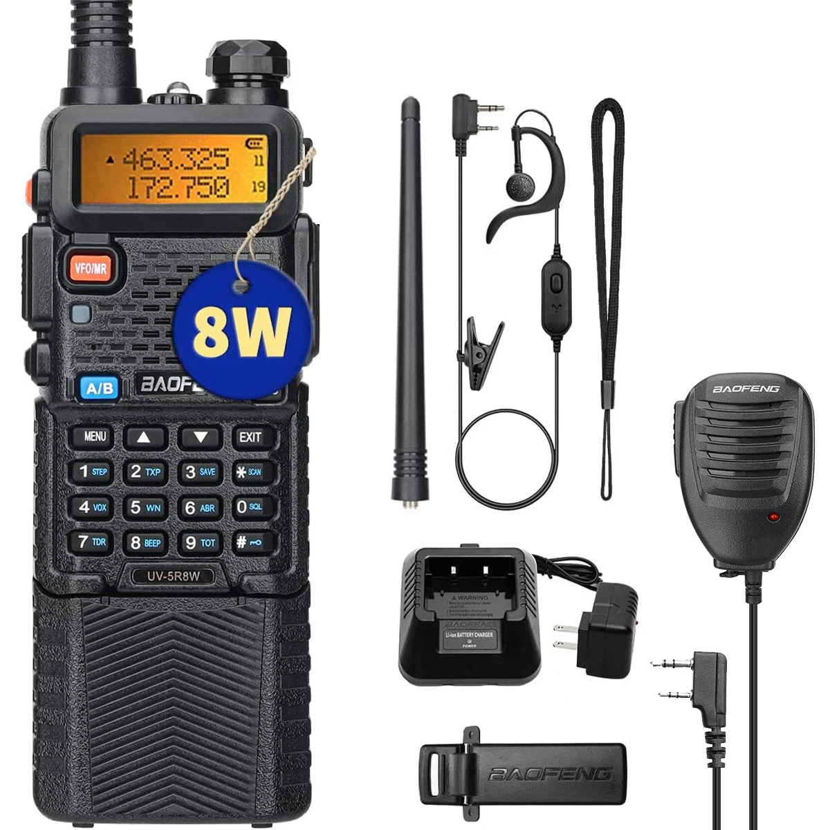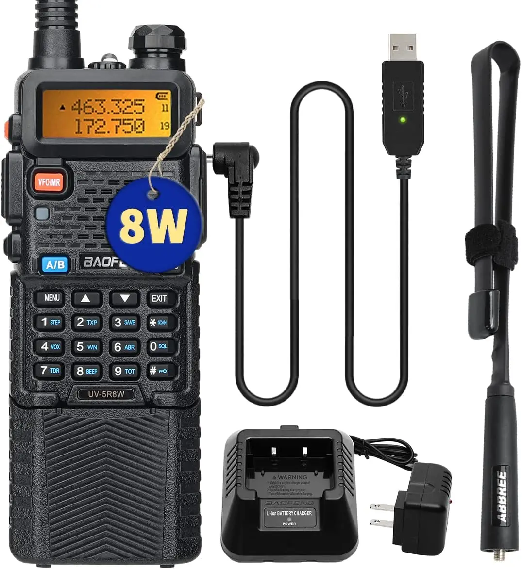 【Ensemble complet professionnel Baofeng UV-5R】 TX haute/moyenne/basse puissance sélectionnable, puissance de sortie : 8 watts.Tout ce dont vous avez besoin est dans une seule boîte!Le contenu de l'emballage comprend : une radio portable, une batterie étendue de 3800 mAh, un chargeur de base américaine, un câble de chargeur USB, une antenne AR-771, un clip de ceinture, une écharpe, un écouteur, un manuel de l'utilisateur.