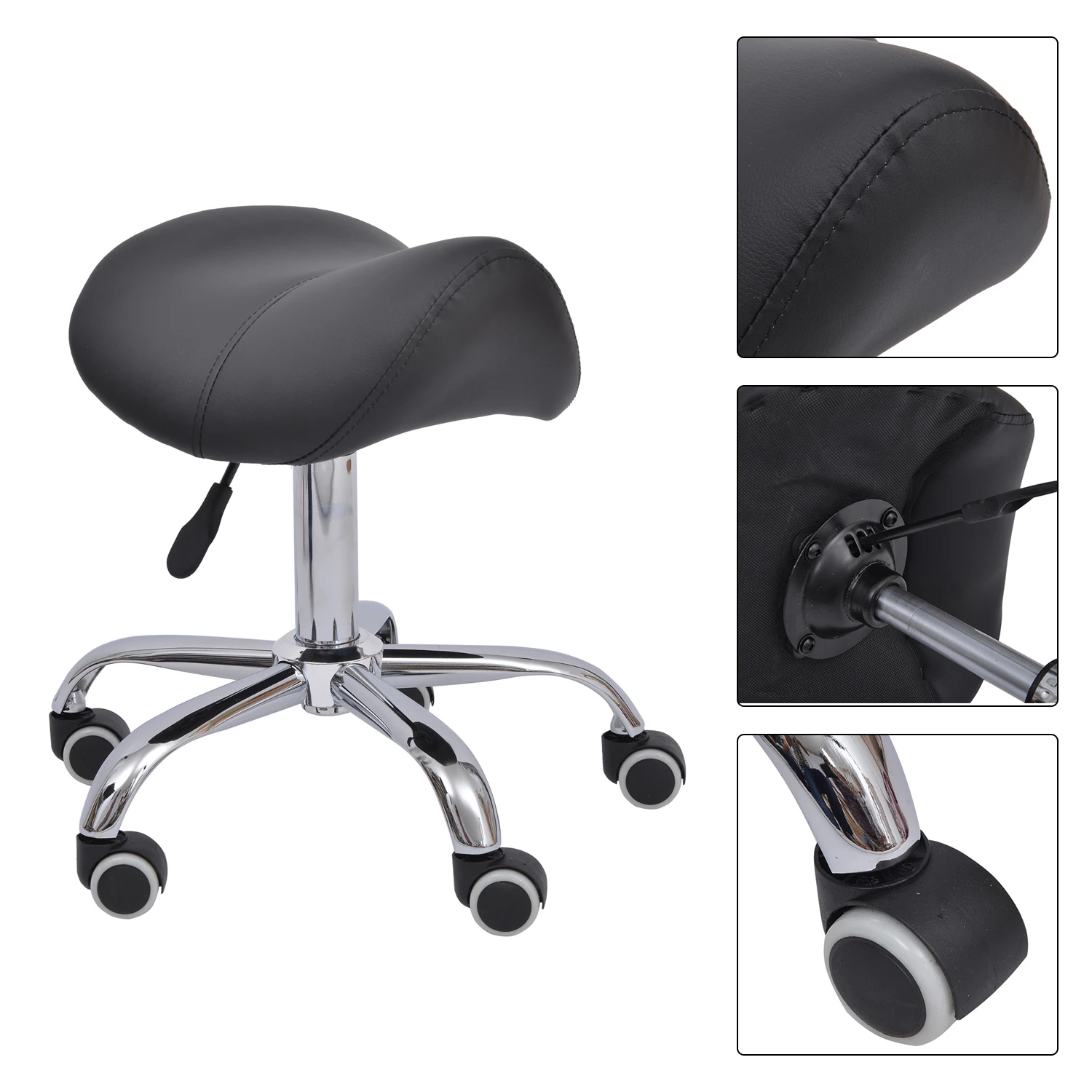 Ce tabouret bas en forme de selle est un siège ergonomique et assure automatiquement une assise verticale, ce qui soulage la colonne vertébrale. Le tabouret est équipé d'un ressort à gaz confortable, réglable en hauteur et rotatif. Le siège rembourré est en polycuir, lisse et facile à nettoyer. La base du tabouret est équipée de cinq roues en PU stables. Le tabouret pratique est idéal pour une utilisation quotidienne à la maison, dans les perruques, salon de beauté ou dans les bureaux.