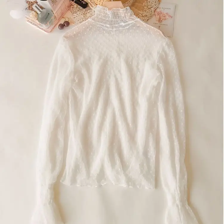 Bella Philosophy femmes col haut maille Perspective Blouse été mince voir à travers mince fond dentelle longues manches évasées hauts