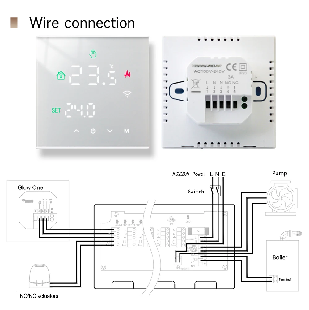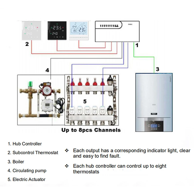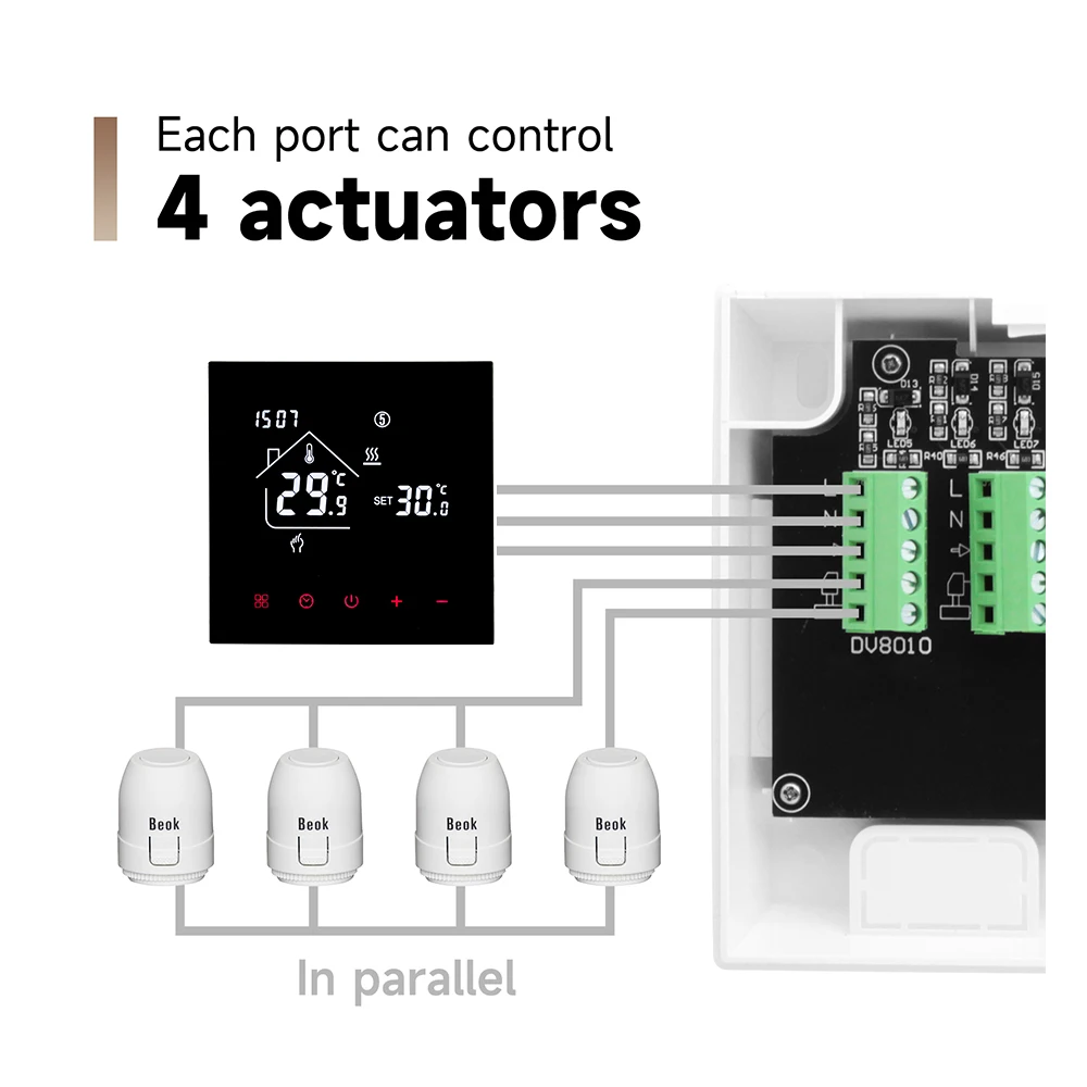 2.Il s'agit d'un contrôleur de hub filaire, le hub, le thermostat et l'actionneur sont tous câblés.Le WiFi signifie que le thermostat peut être contrôlé par le téléphone mobile via l'application.