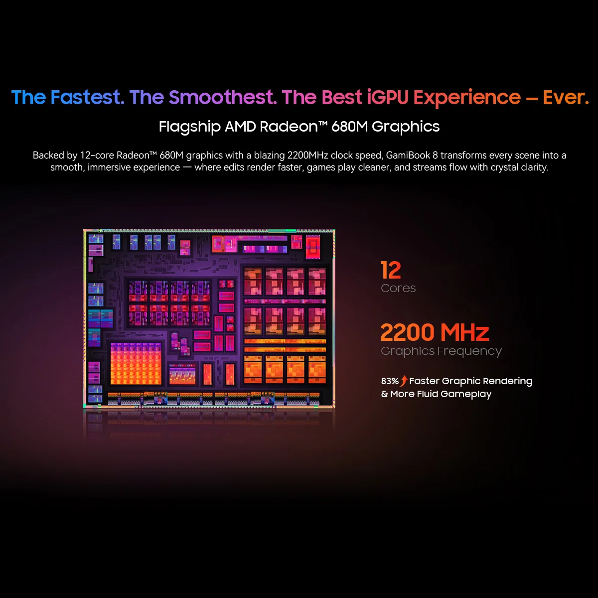 Soutenu par Radeon 12 cœurs™ Graphiques de 680 Mo avec une vitesse d'horloge incroyable de 2 200 MHz, GamiBook 8 transforme chaque scène en une expérience fluide et immersive – où les édits rendent plus rapides, les jeux jouent plus propres et les flux coulent avec une clarté cristalline.