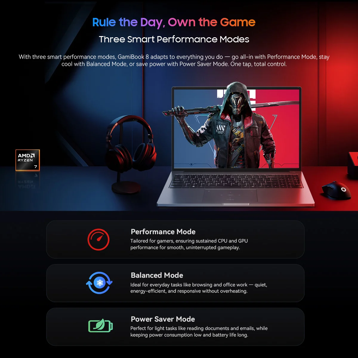 Avec trois modes de performance intelligents, GamiBook 8 s'adapte à tout ce que vous faites : continuez en mode Performance, restez au frais grâce au mode Équilibré ou économisez de l'énergie en mode Power Saver.Un clic, contrôle total.