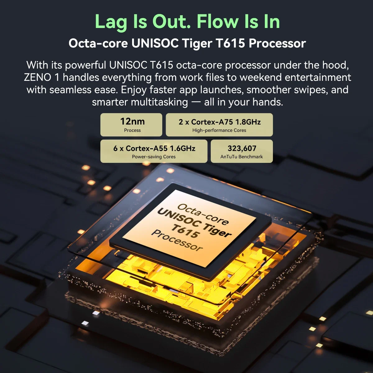 Processeur : Octa-core Unisoc T615, 2 x A75 à 1,6 GHz + 6 x A55 à 1,6 GHz