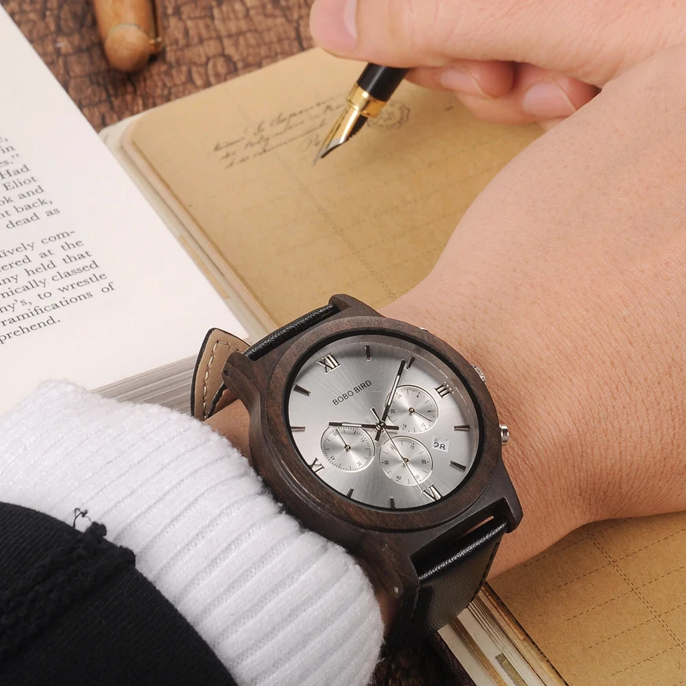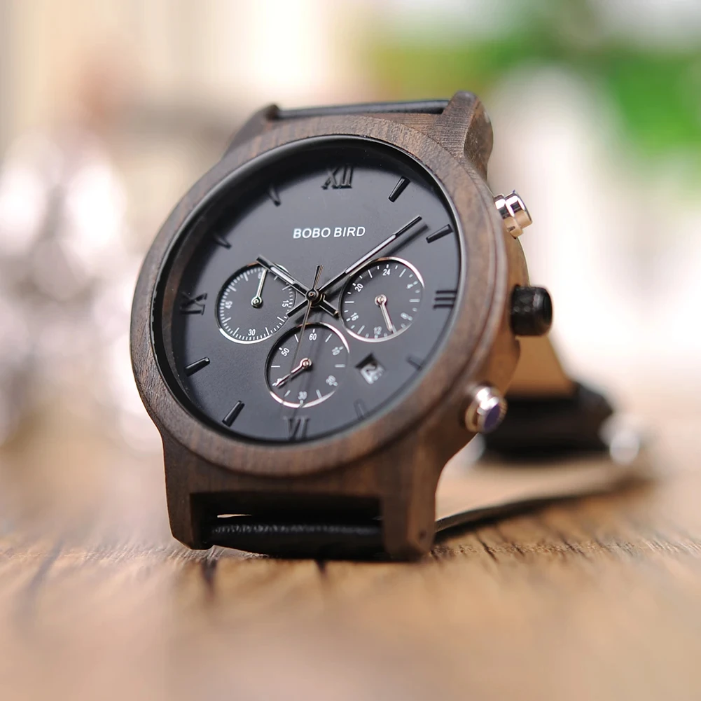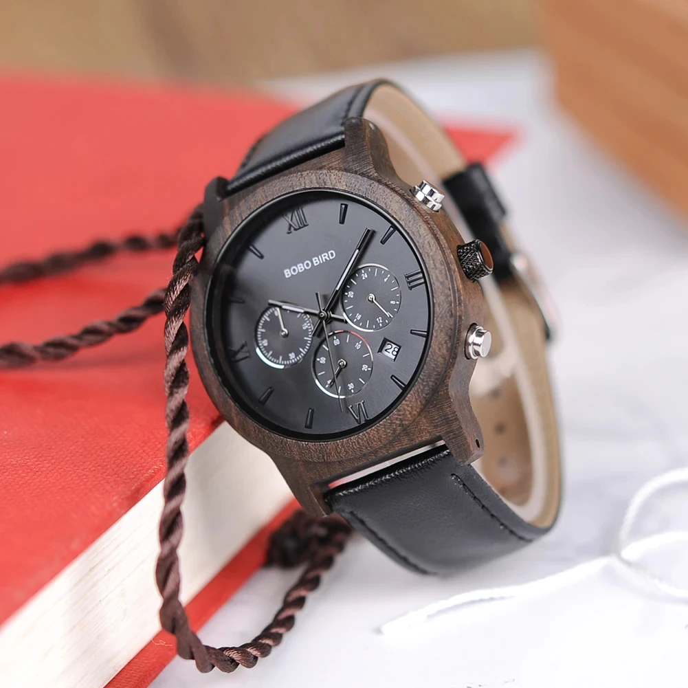 BOBO BIRD-Montre-bracelet à quartz en bois pour homme, horloge Shoous, bracelet en cuir, nouveau design, grande boîte cadeau, mode