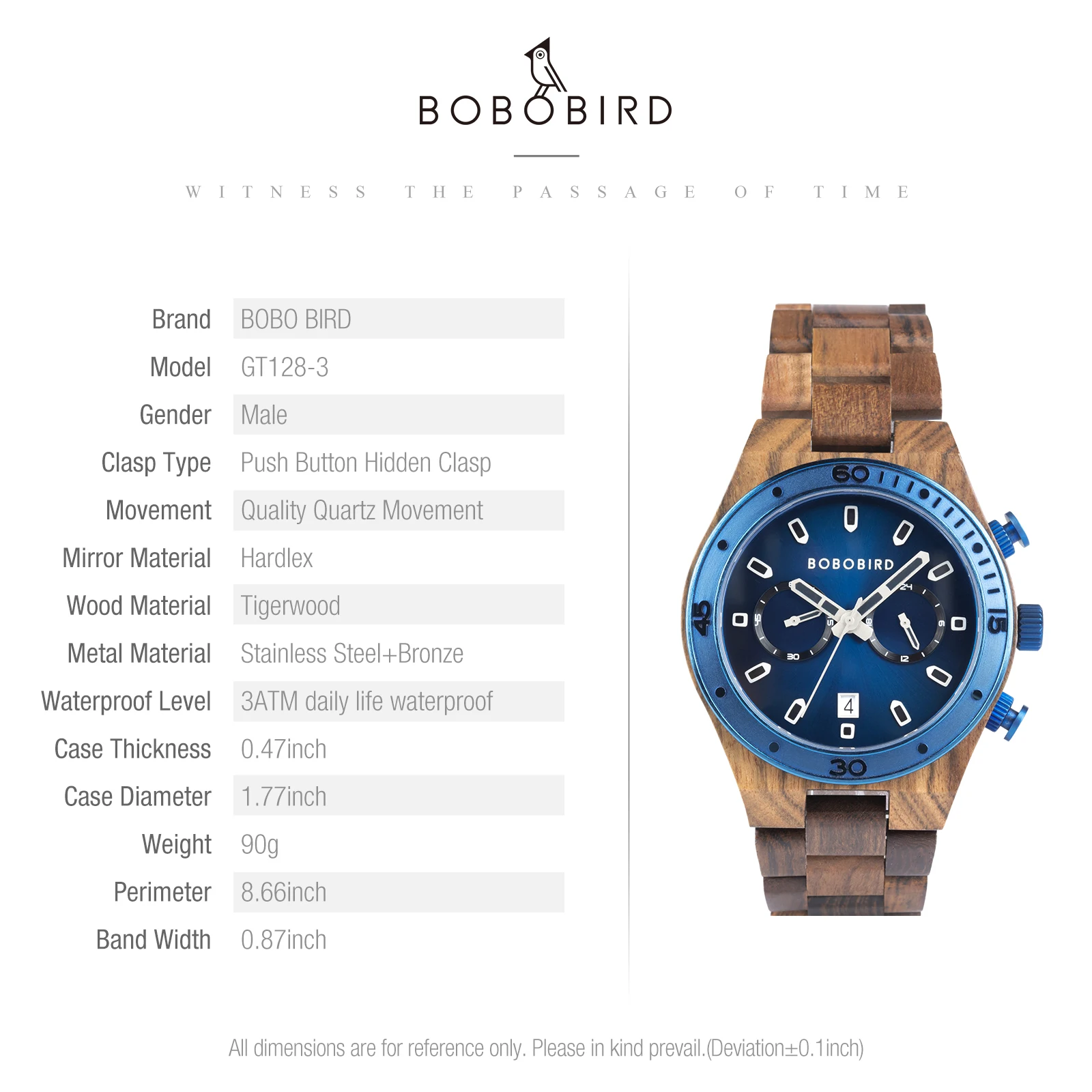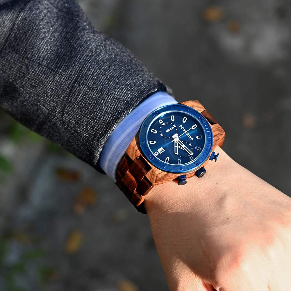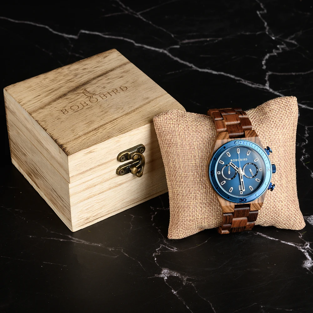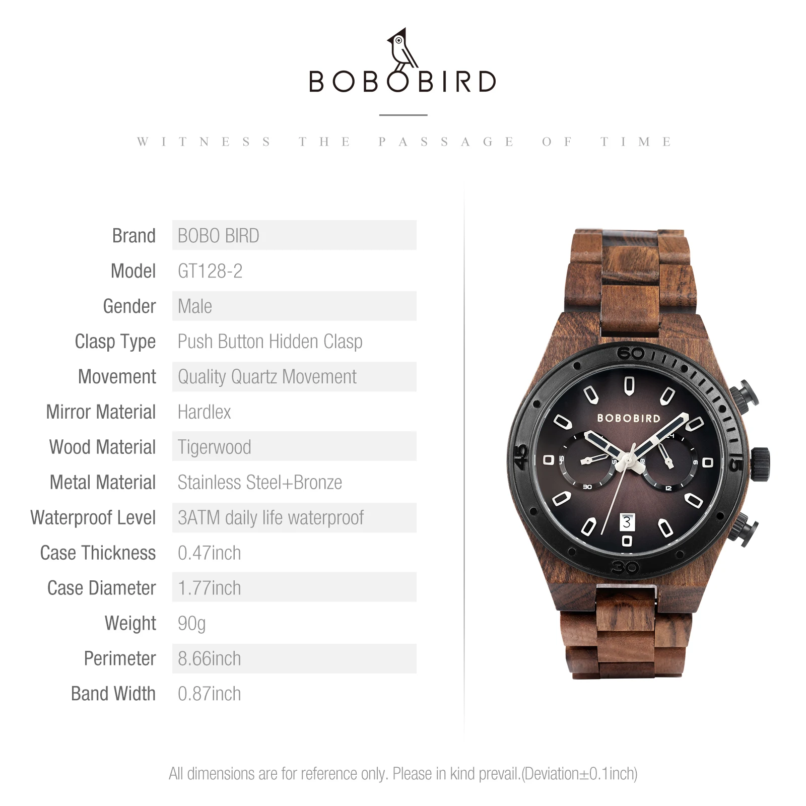 BOBO BIRD montre en bois hommes d'affaires montres à Quartz gravé en bois chronographe montre-bracelet avec affichage de la Date personnalisé reloj madera