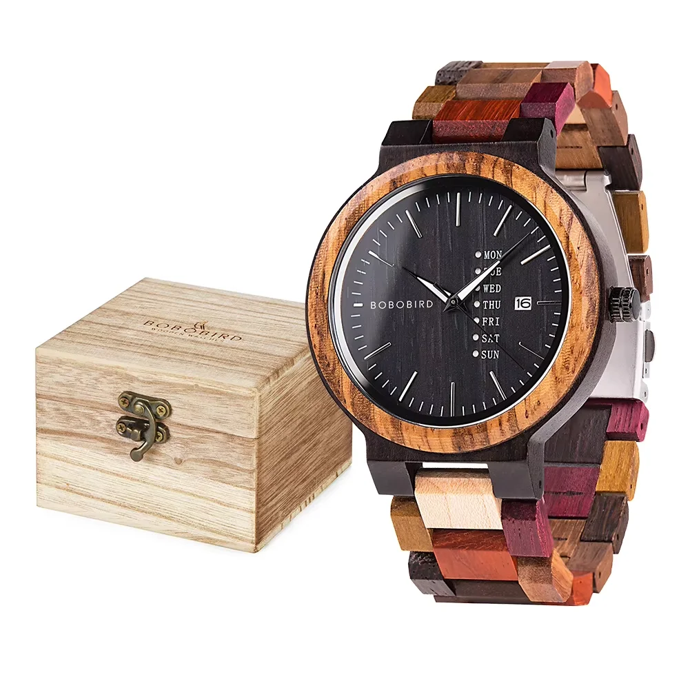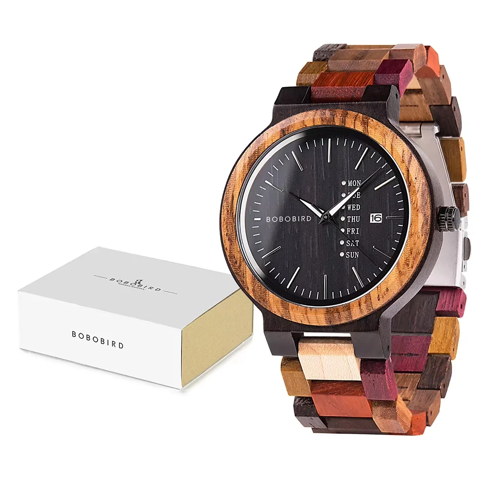BOBO BIRD montre en bois hommes femmes Quartz semaine Date Couple montre coloré bracelet en bois Logo personnaliser boîte-cadeau en gros livraison directe