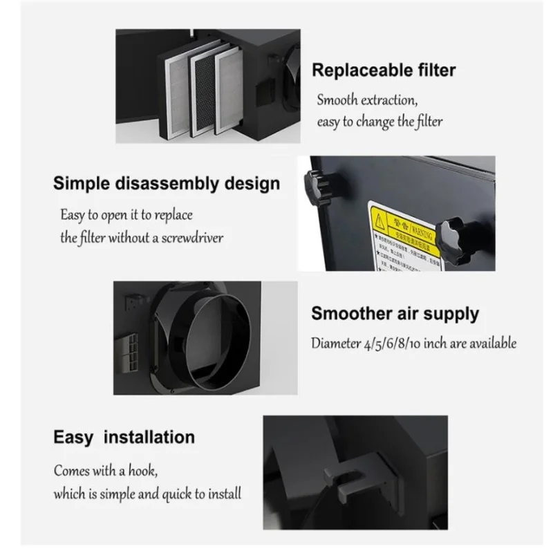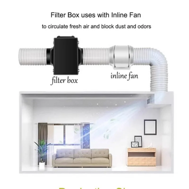 1. La boîte de filtre fonctionne avec les ventilateurs en ligne, fait circuler l'air frais et bloque la poussière et les odeurs. Filtre à haute efficacité qui retient les particules telles que la poussière, la saleté, les peluches et les odeurs.