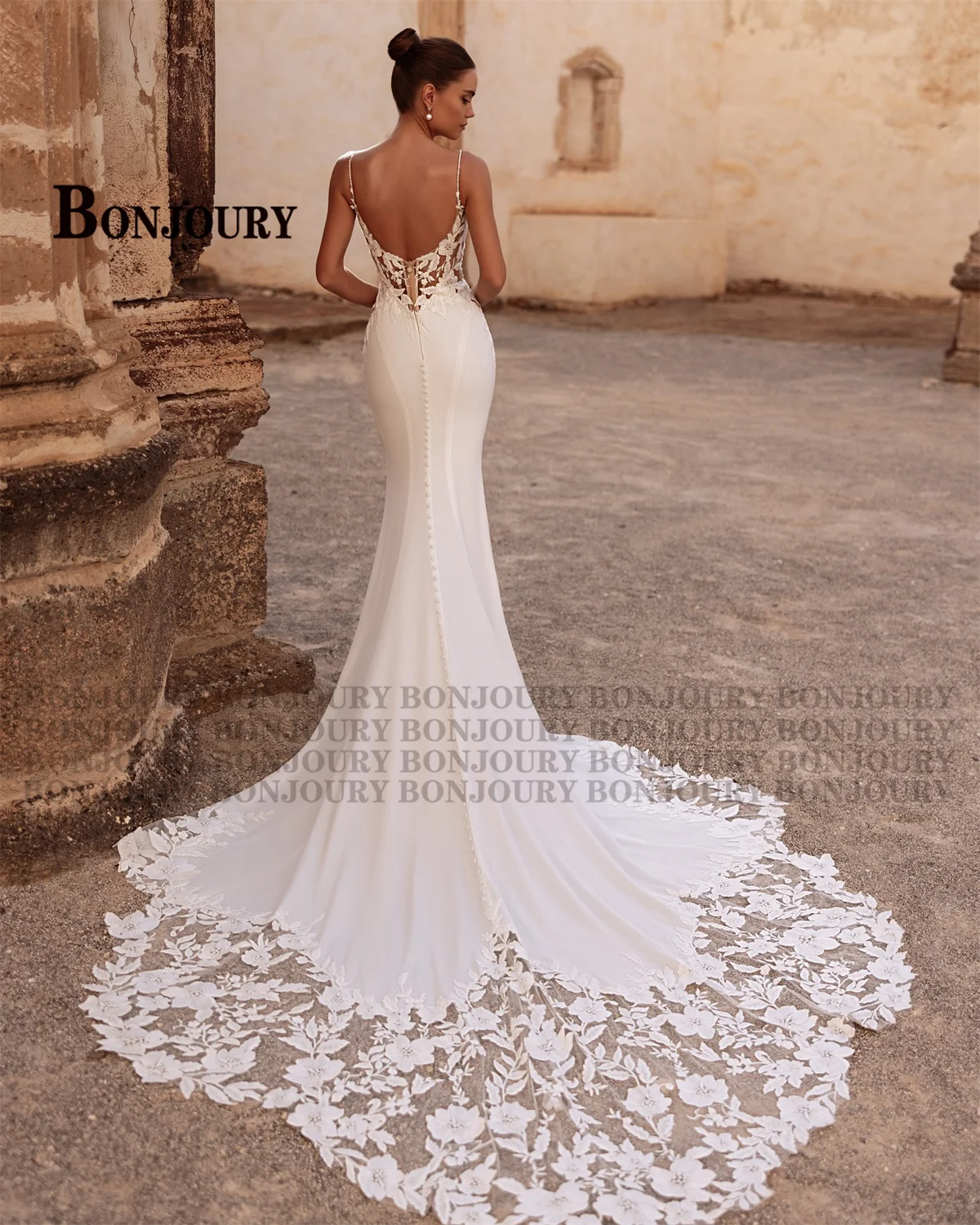 BONJOURY Robe De mariée en Satin à la mode bretelles Spaghetti dentelle Appliques trompette Satin Court Train robes De Novia personnalisé