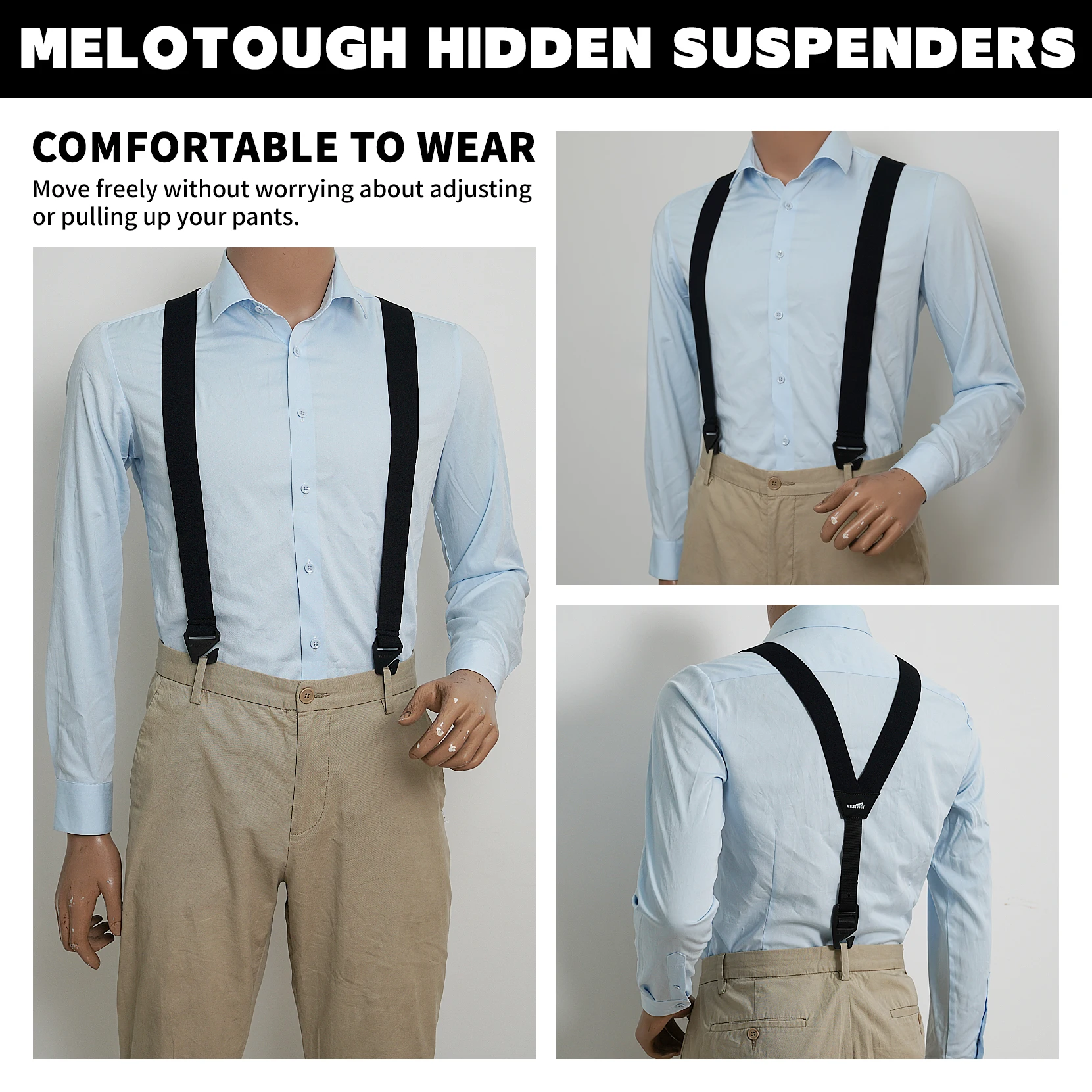 Boucles renforcées : mises à partir de boucles en plastique communes pour des boucles durables améliorées pour une résistance et une longévité supérieures, réduisant considérablement le risque de casse. Avec une construction robuste, les bretelles pour hommes sous les vêtements offrent une durabilité fiable.