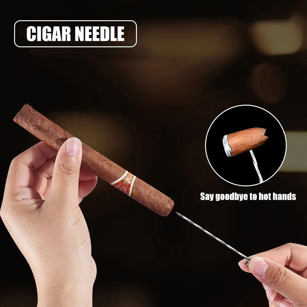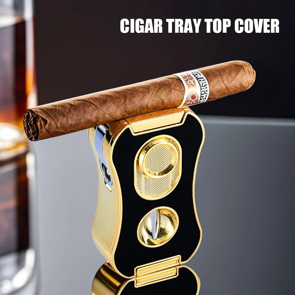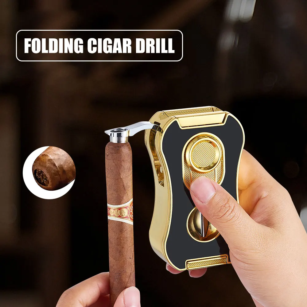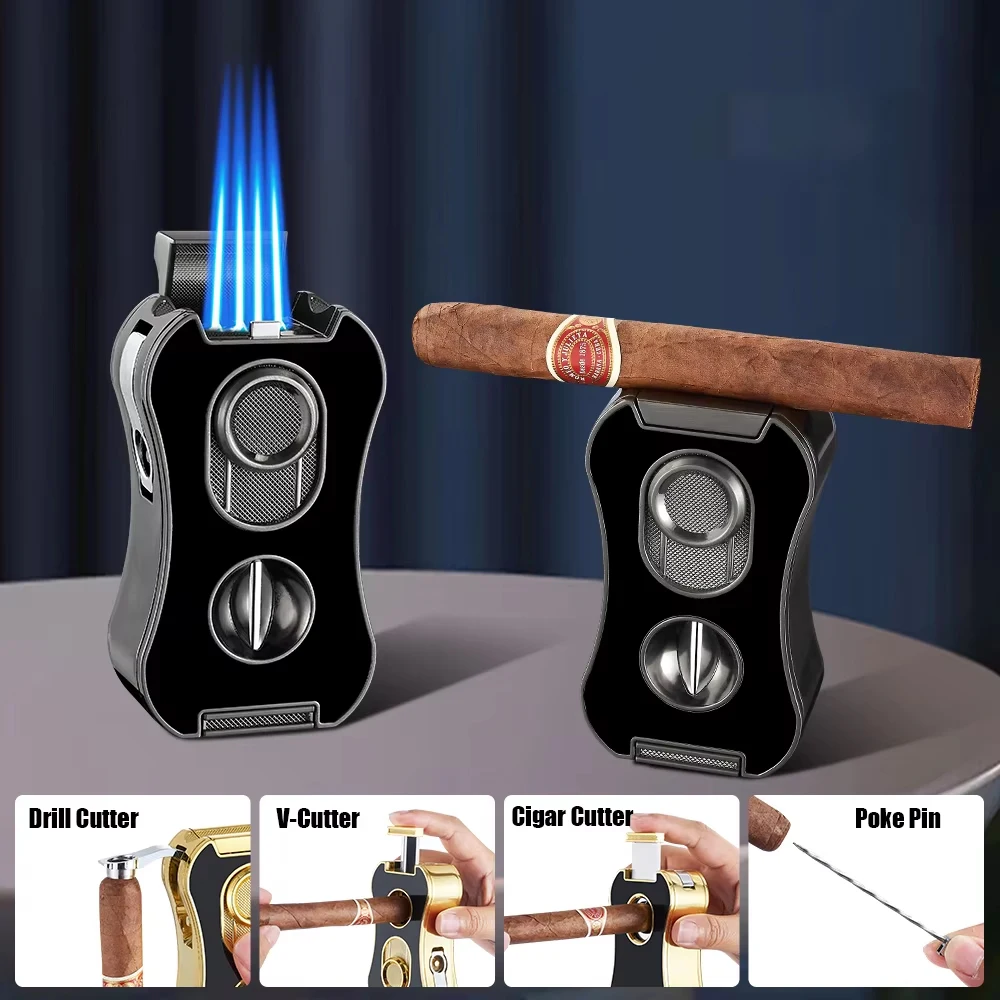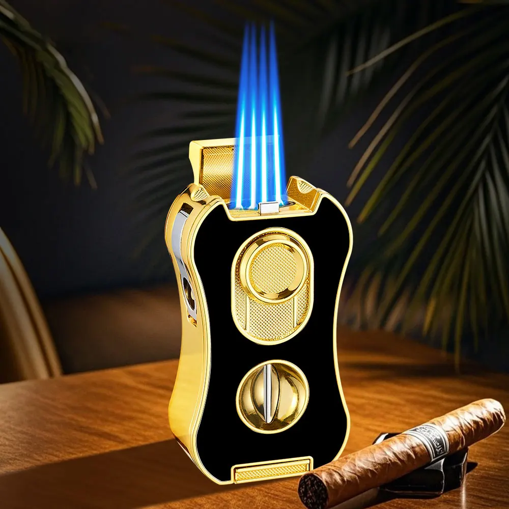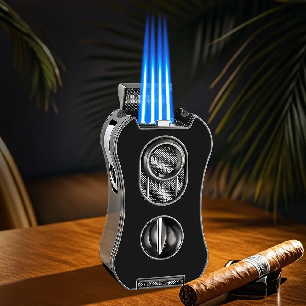 Briquet à cigares 6-en-1 robuste à quatre flammes bleues, portable, avec coupe-cigares intégré, corps en alliage, taille de flamme réglable