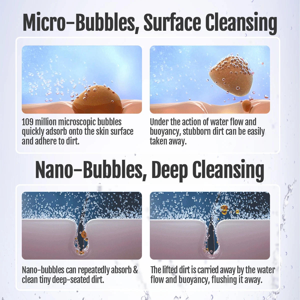 : Plus de 100 millions de microbilles par millilitre pénètrent profondément dans les pores, faisant adieu à la saleté.