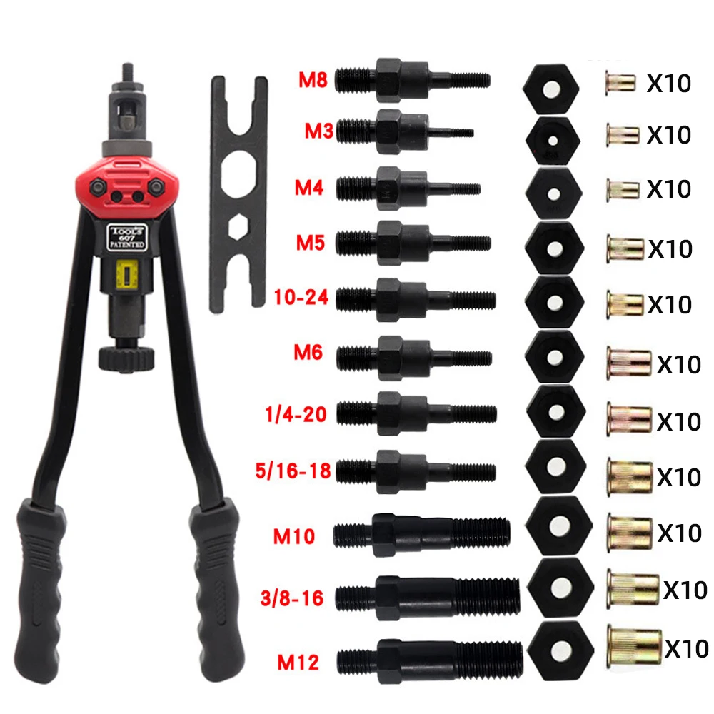 Outil de rivets filetés à la main BT-607 Riveteuse avec 110 pièces crous à riveter M3 M4 M5 M6 M8 M10 M12 1/4 10-24 5/16 3/8 Rivnut Rivet Tool