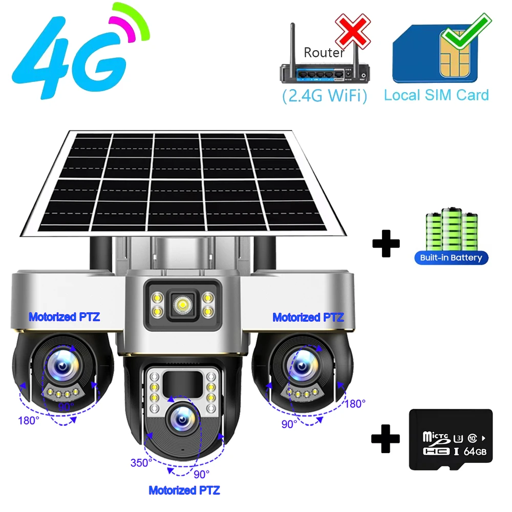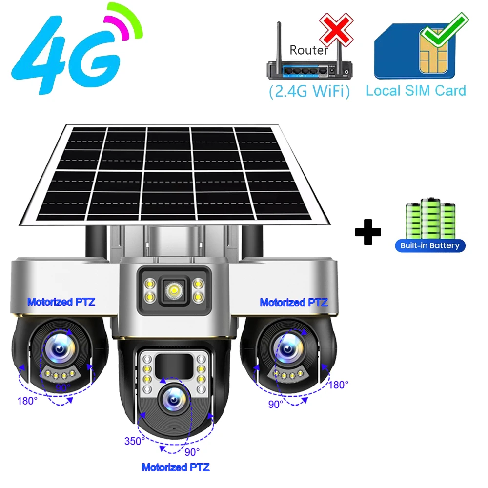 Caméra solaire V380 Pro 4G avec carte SIM de trafic 100M, vidéosurveillance IP sans fil LTE, batterie 8000mAh, 3 objectif PTZ, caméras de vidéosurveillance