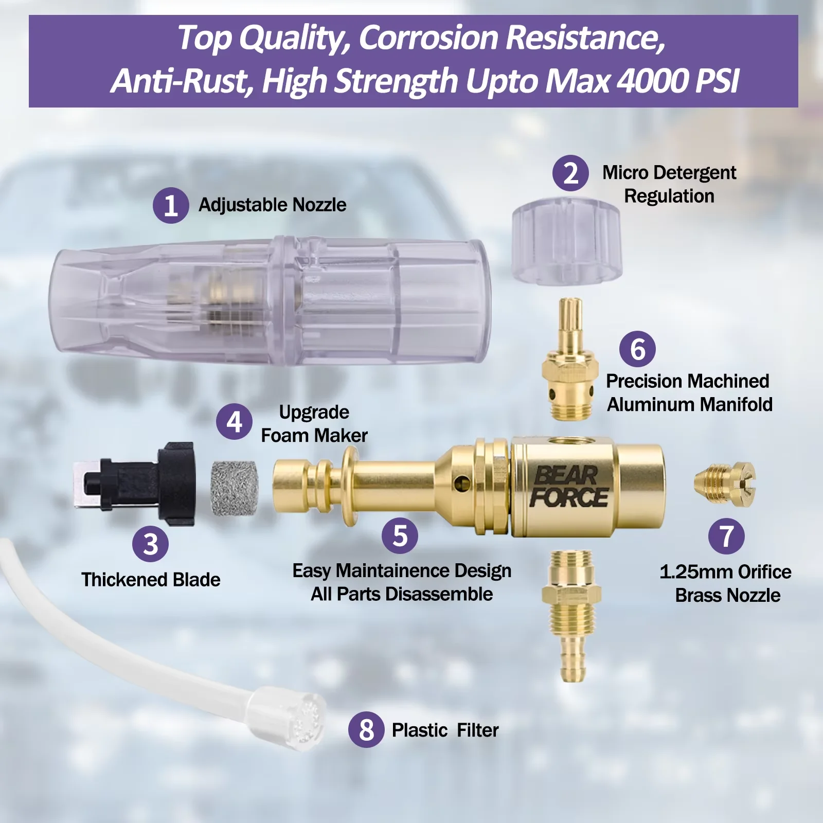Canon à mousse puissant, pulvérise de la mousse de savon jusqu'à 6 m/ 20 pieds ; Crépine grande et uniformément câblée améliorée pour une mousse plus dense et épaisse.Le canon à mousse pour nettoyeur haute pression est composé d'un collecteur en aluminium et d'un couvercle en nylon, livré avec une bouteille de 32 oz/1000 ml, une conception unique, un artisanat raffiné, un usinage de précision, robuste, résistant à la corrosion, une durée de vie durable, peut créer une mousse de neige épaisse et dense pour laver votre voiture et vos véhicules.