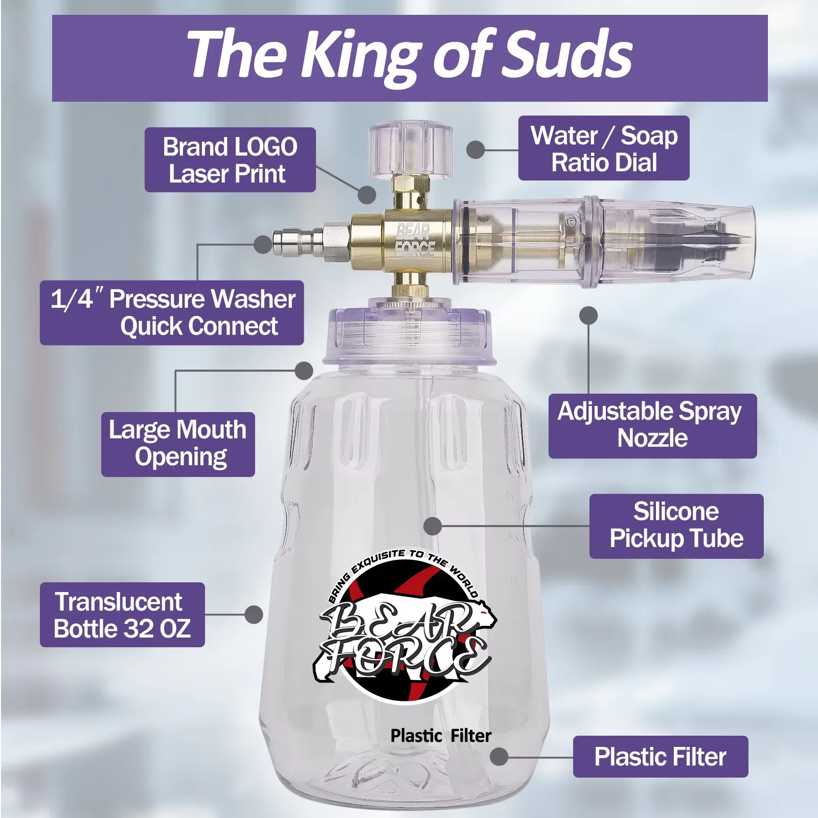 Canon à mousse pour nettoyeur haute pression, Lance à mousse réglable, connecteur rapide 1/4, Blaster à mousse pour lavage de voiture à domicile, bouteille transparente, nettoyage de voiture