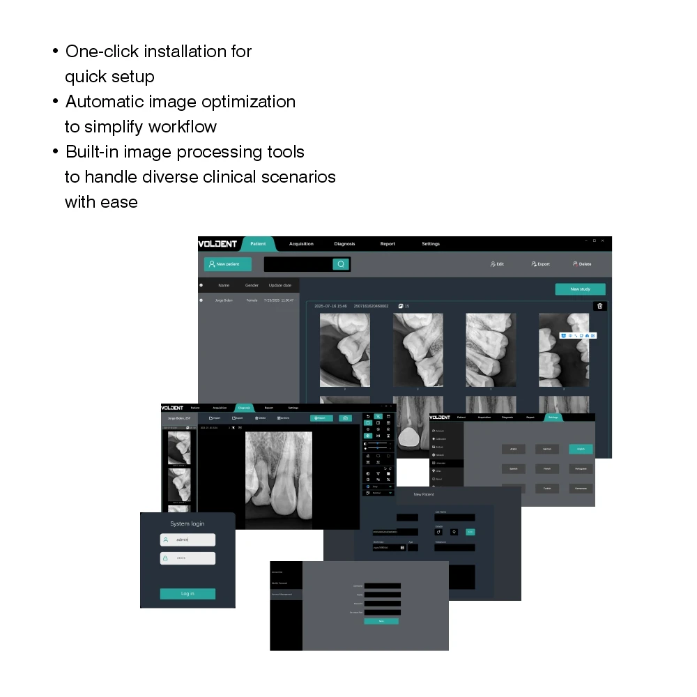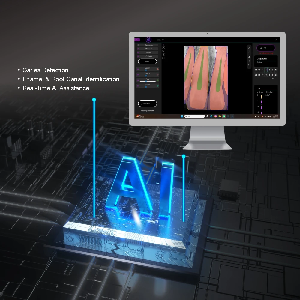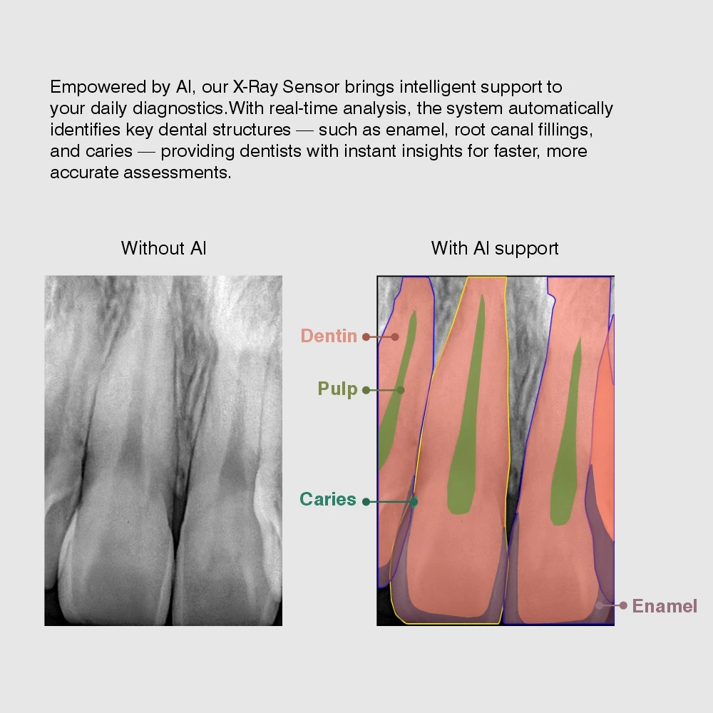 Renforcé par Al, notre capteur XRay apporte un soutien intelligent à votre diagnostic quotidien.Avec une analyse en temps réel, le système identifie automatiquement les structures dentaires clés, telles que l'émail et les garnitures de conduits radiculaires.et les caries – offrant aux dentistes des idées instantanées plus rapidement.évaluations plus précisesDétection de caries