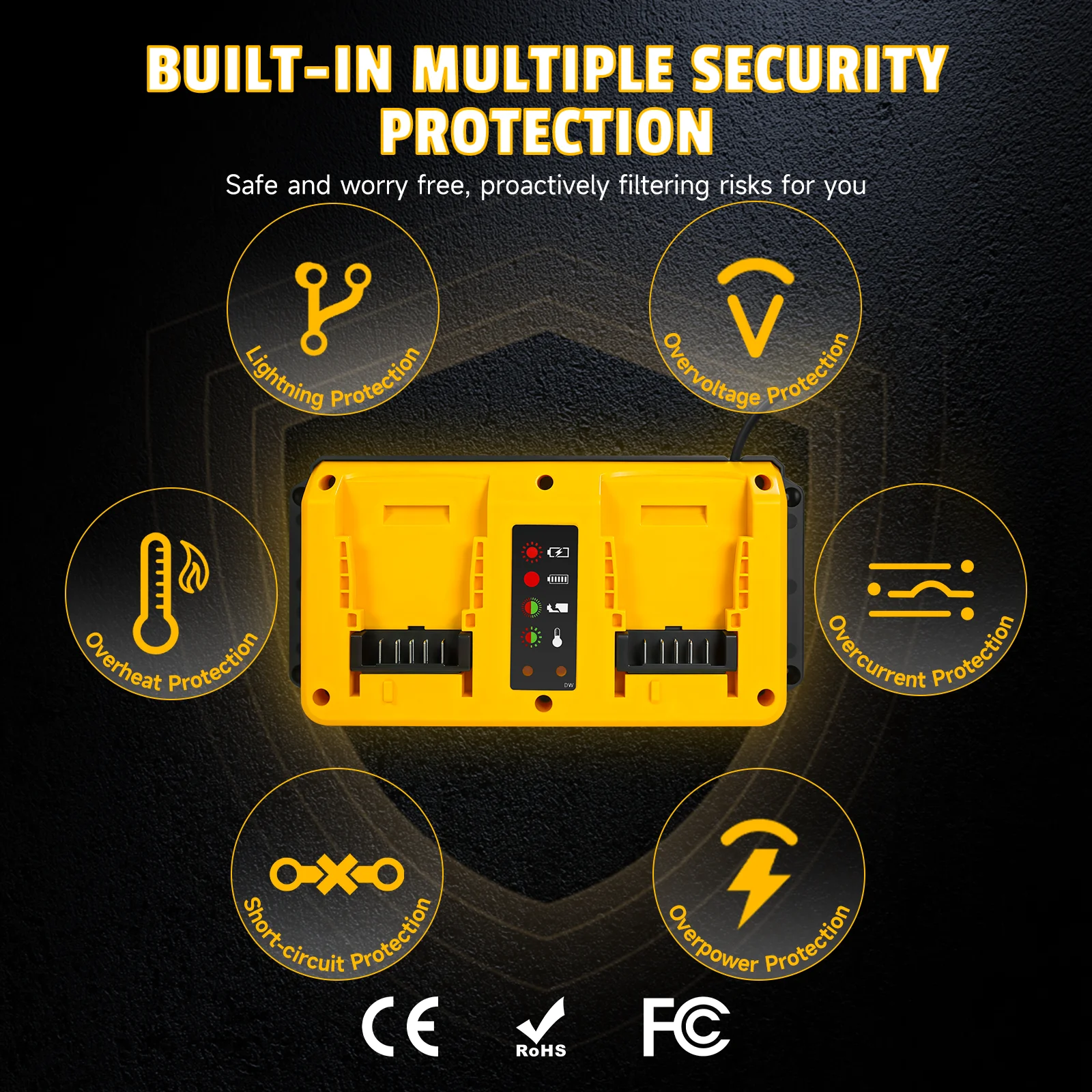 Chargement à double port : Entrée : CA 100-240 V 50/60 Hz, Sortie : 18/20 V 1,5 A ; Charge efficacement deux batteries simultanément pour vos outils, vous faisant gagner du temps et vous assurant que vos outils sont toujours prêts à l'emploi.