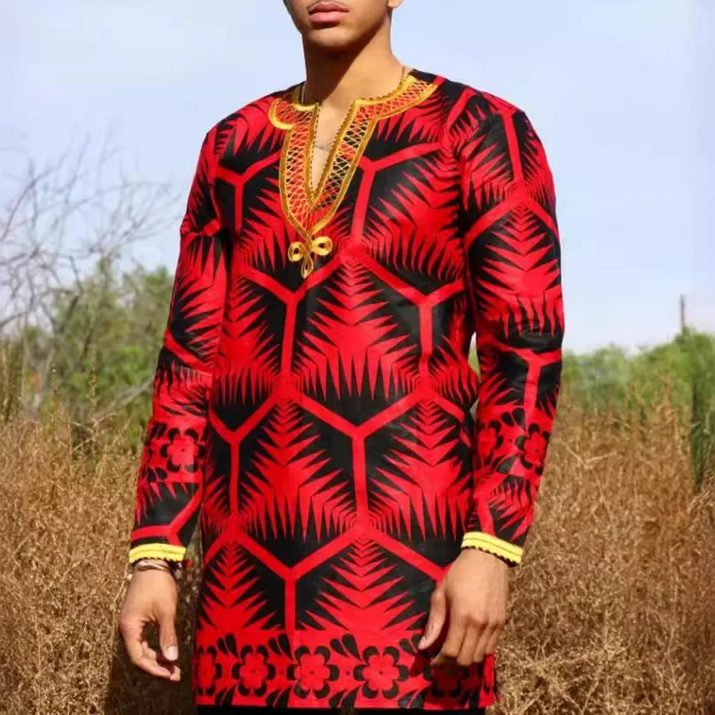 Chemise à manches longues pour hommes, col montant, imprimé doré, tendance, Hip Hop, afrique, vêtements décontractés, Style ethnique, haut mi-long, 2026