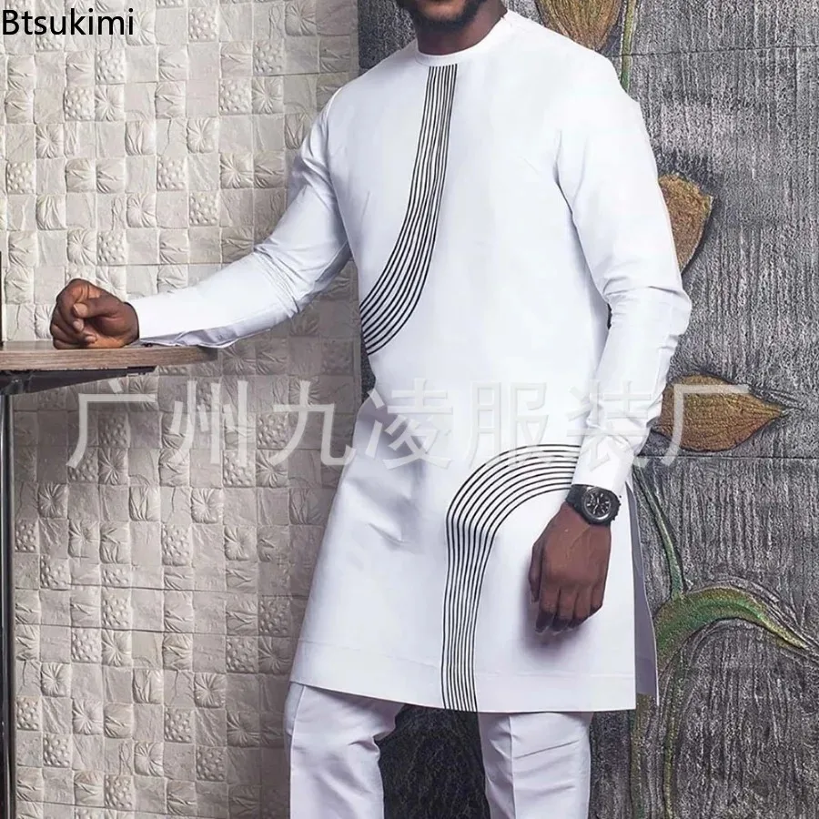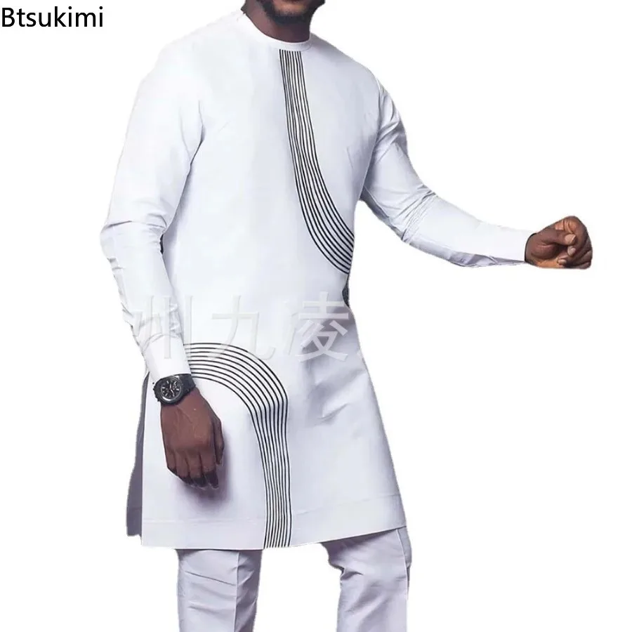 Style ethnique africain Tribal hommes chemises col rond à manches longues affaires décontracté mince Blouses confortable traditionnel hauts longs Gentleman