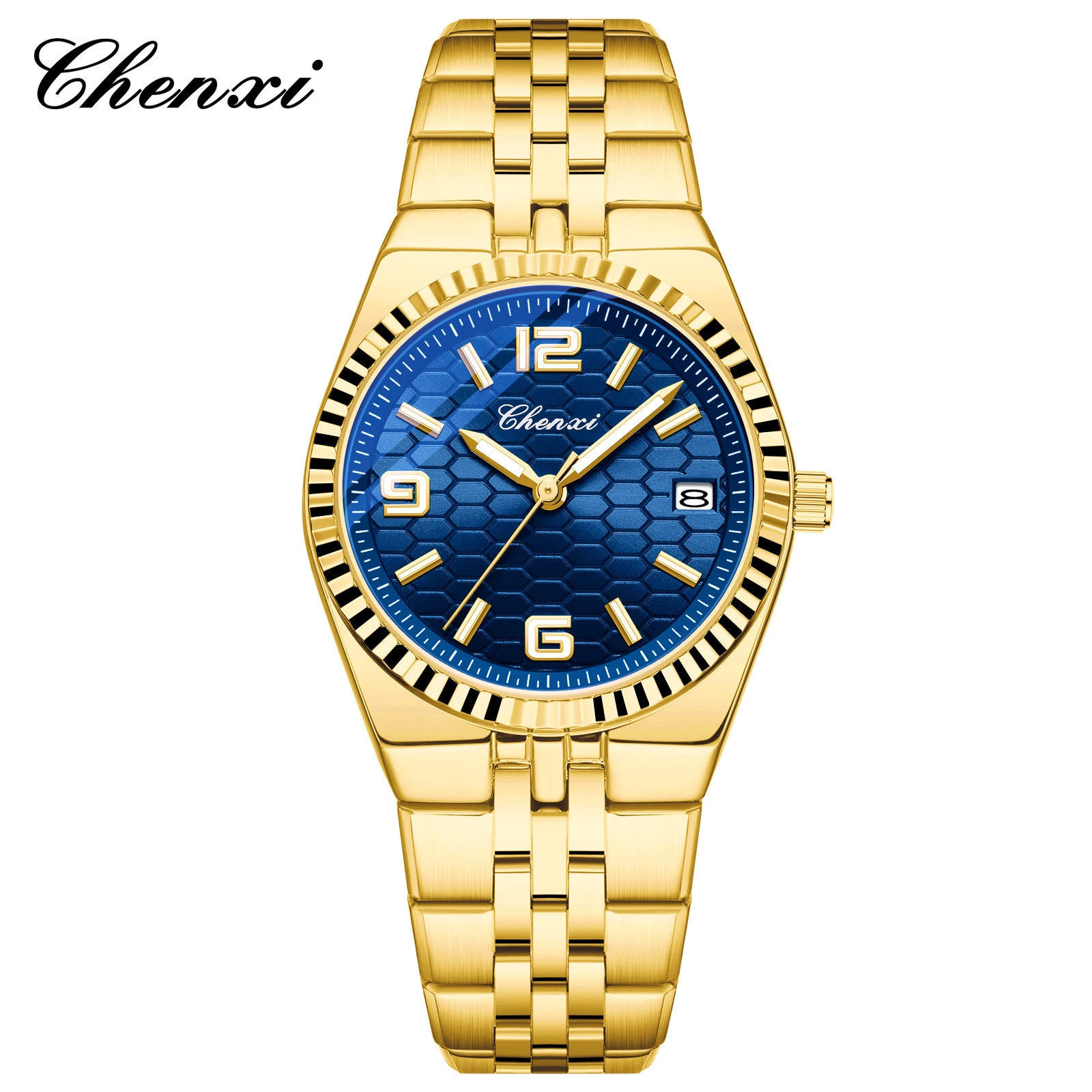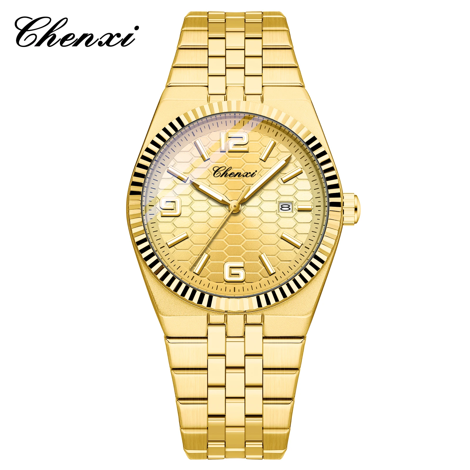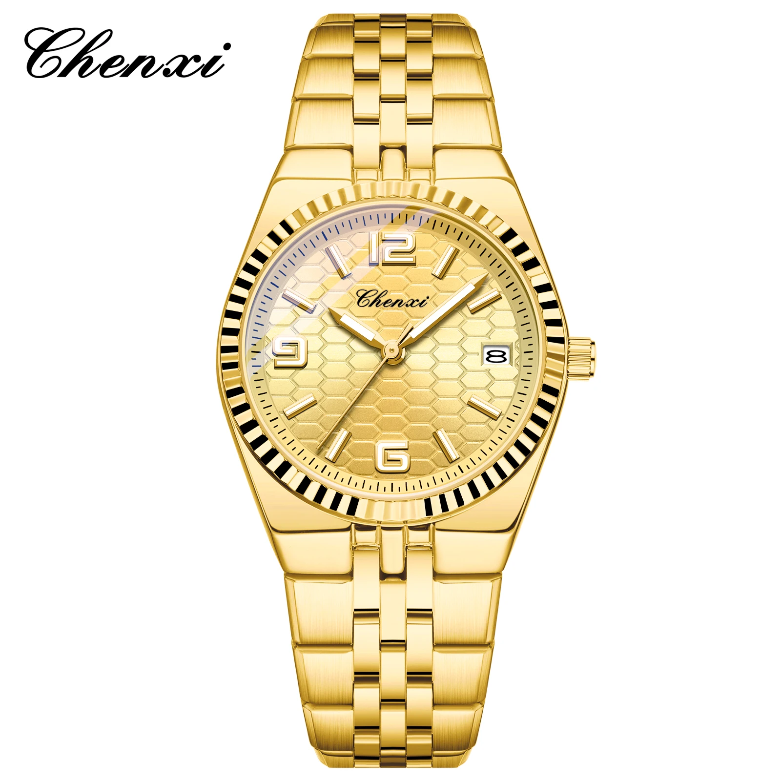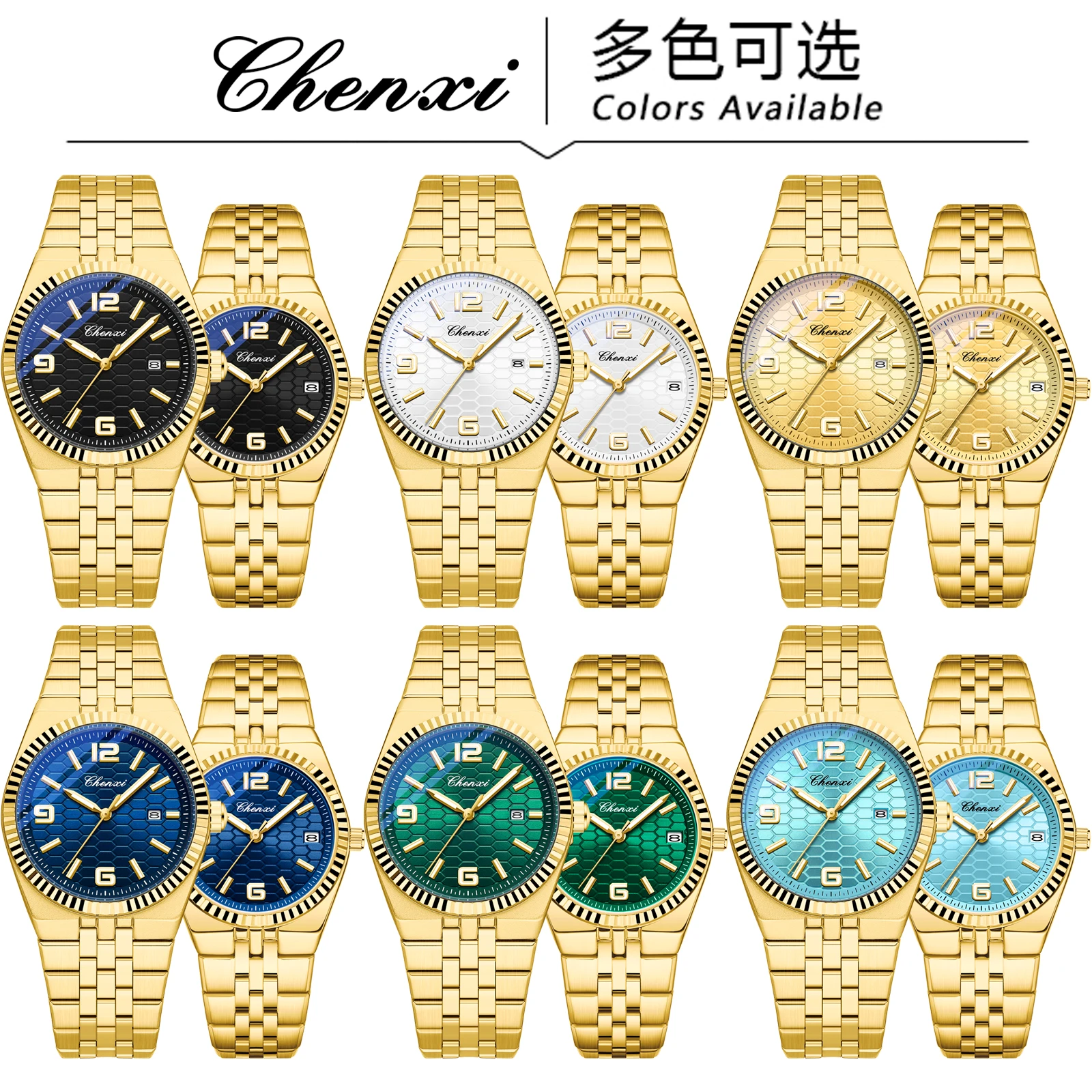 CHENXI 8280 Montres à quartz tendance pour couple, calendrier, lumineuses, bracelet en acier inoxydable doré, élégantes, montres-bracelets pour homme et femme, relógio