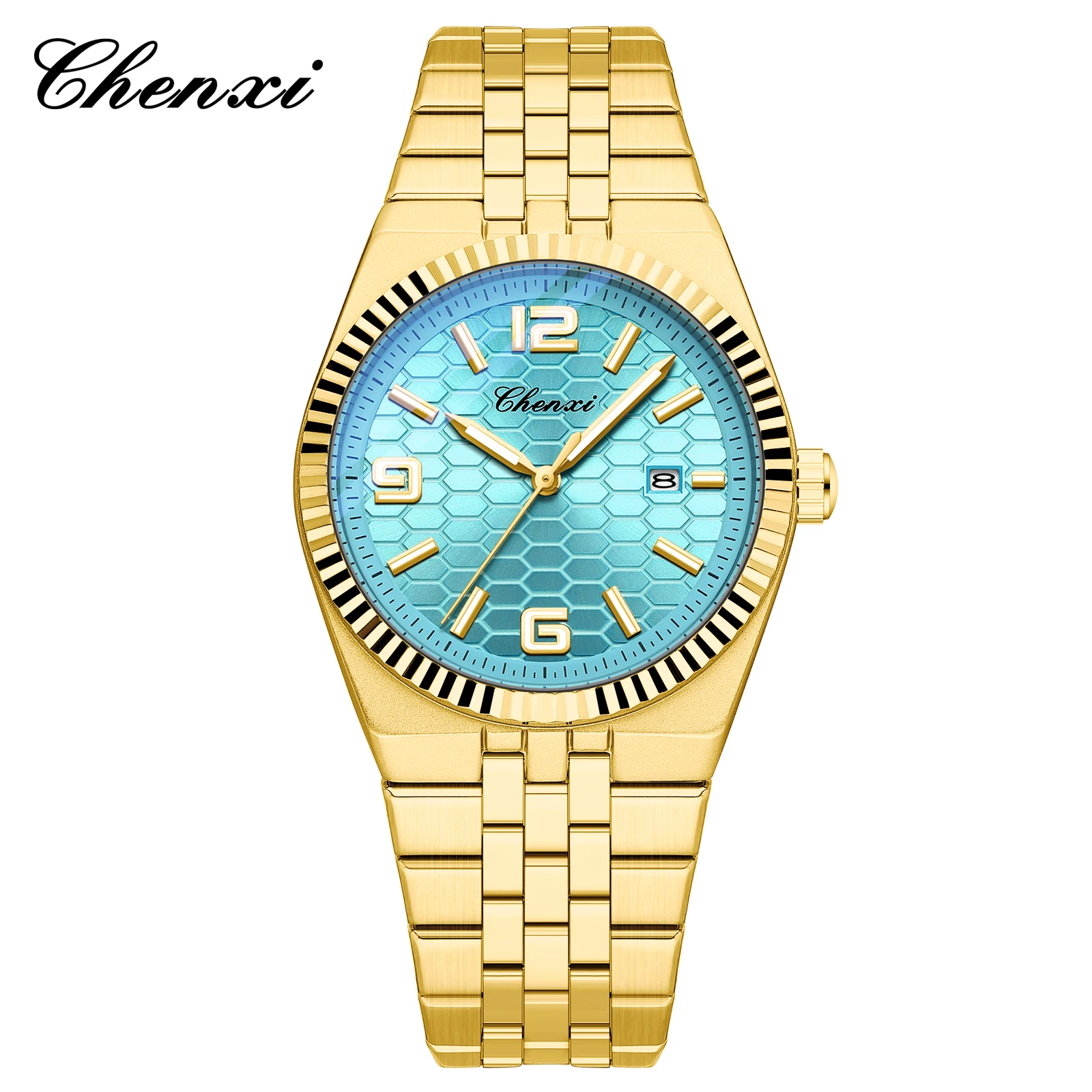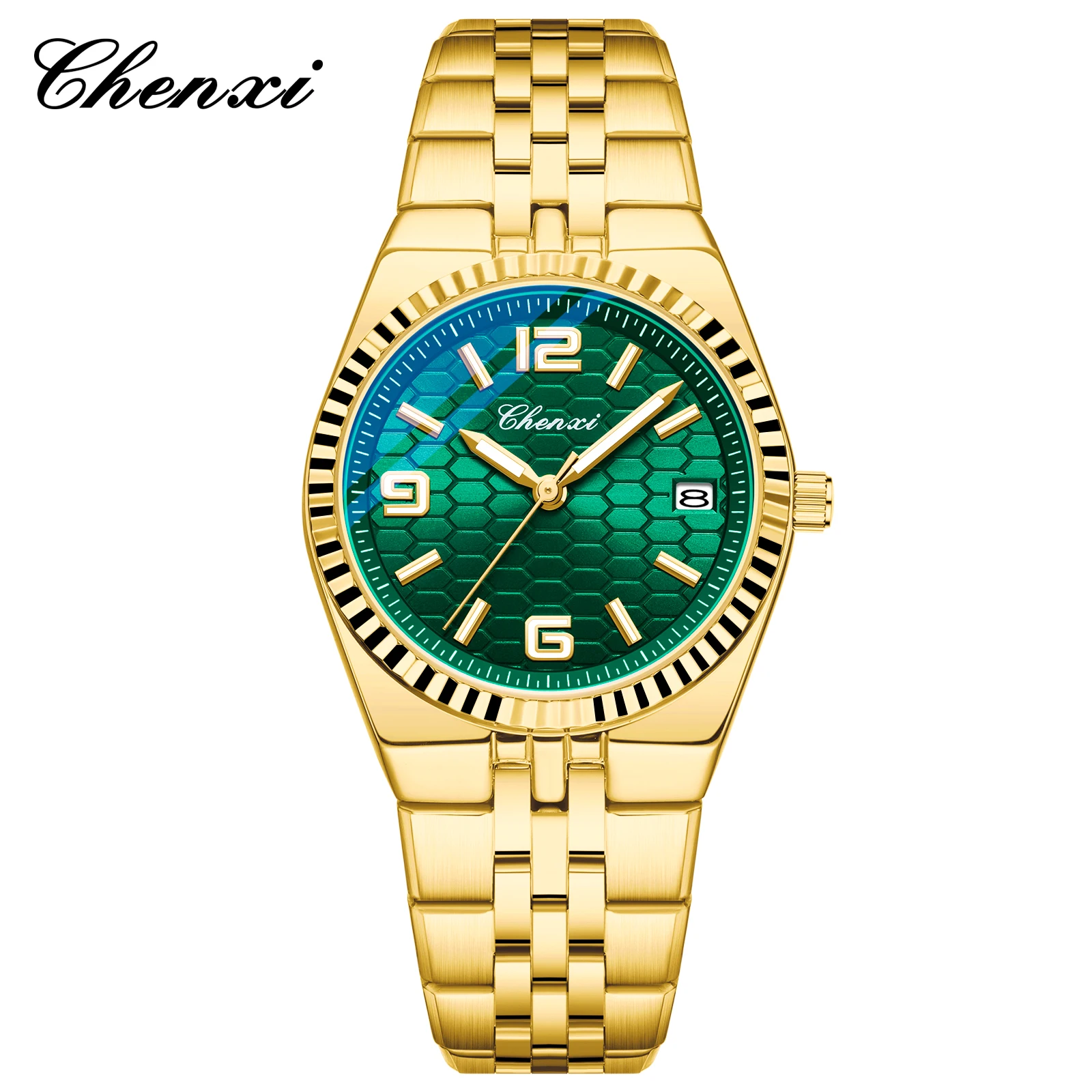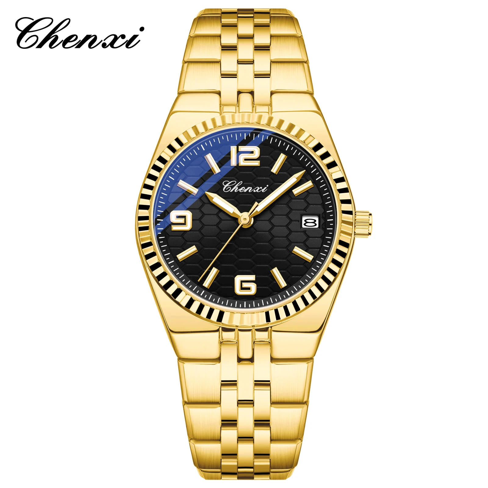 CHENXI 8280 Montres à quartz tendance pour couple, calendrier, lumineuses, bracelet en acier inoxydable doré, élégantes, montres-bracelets pour homme et femme, relógio