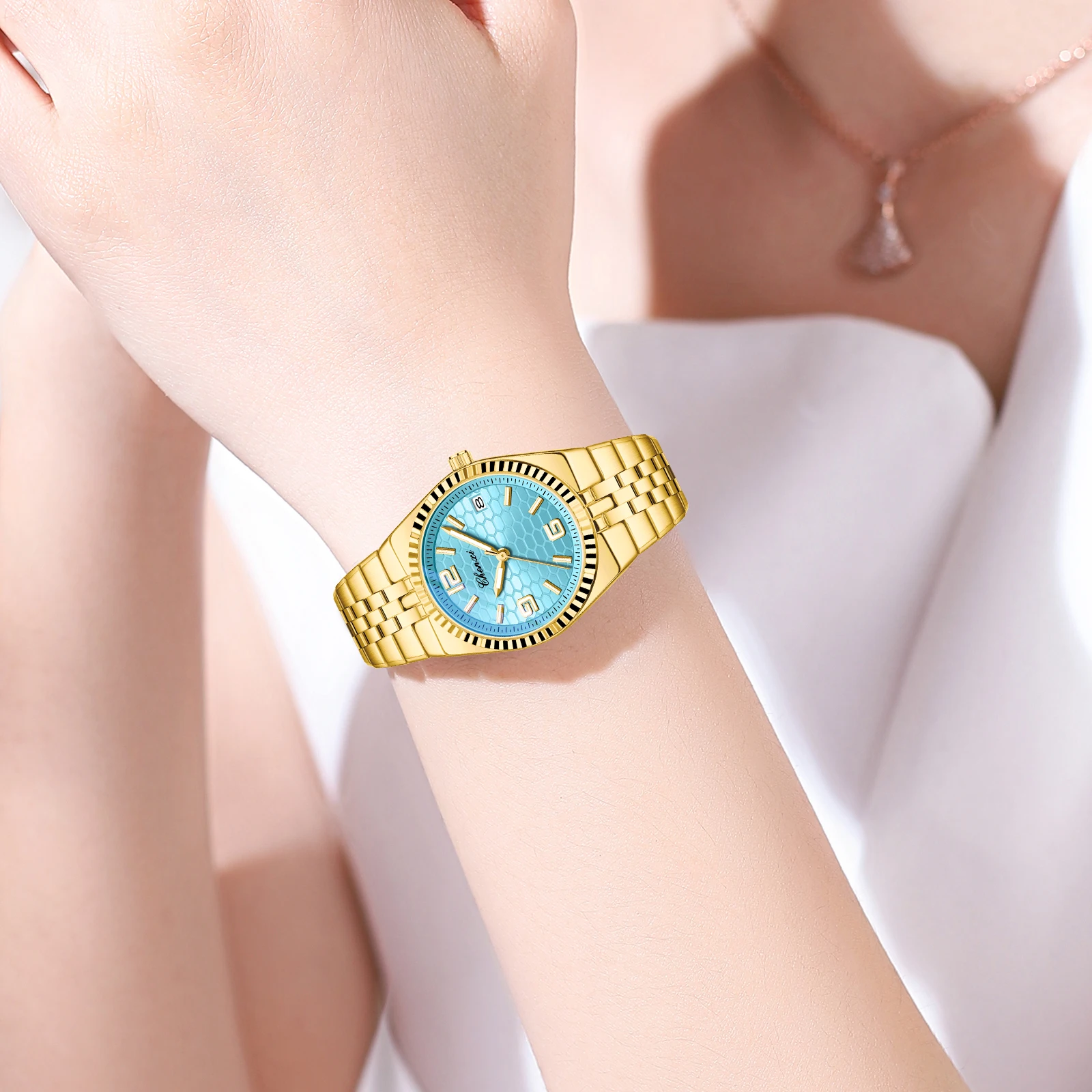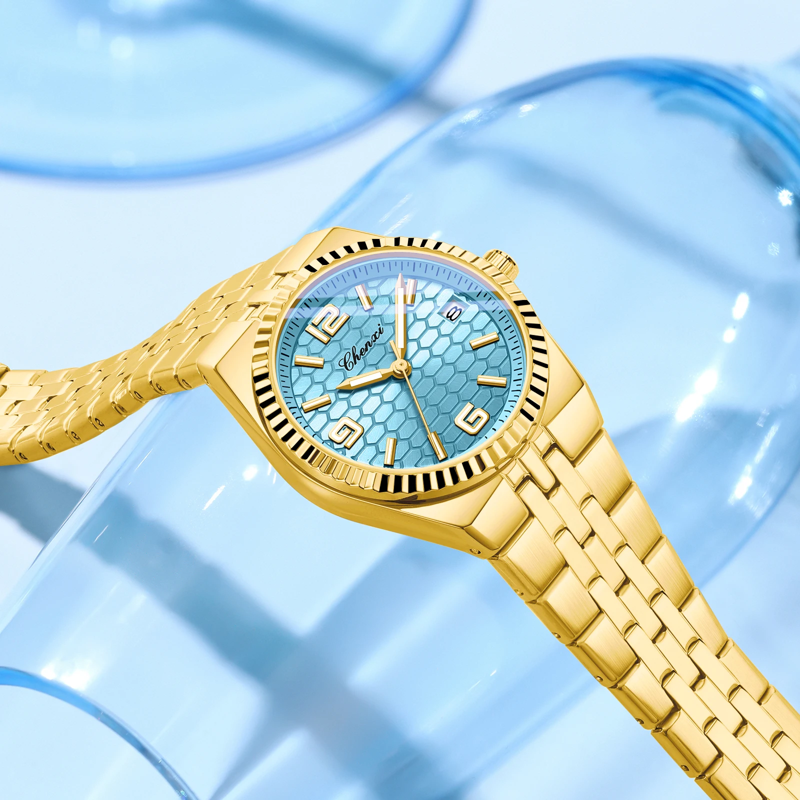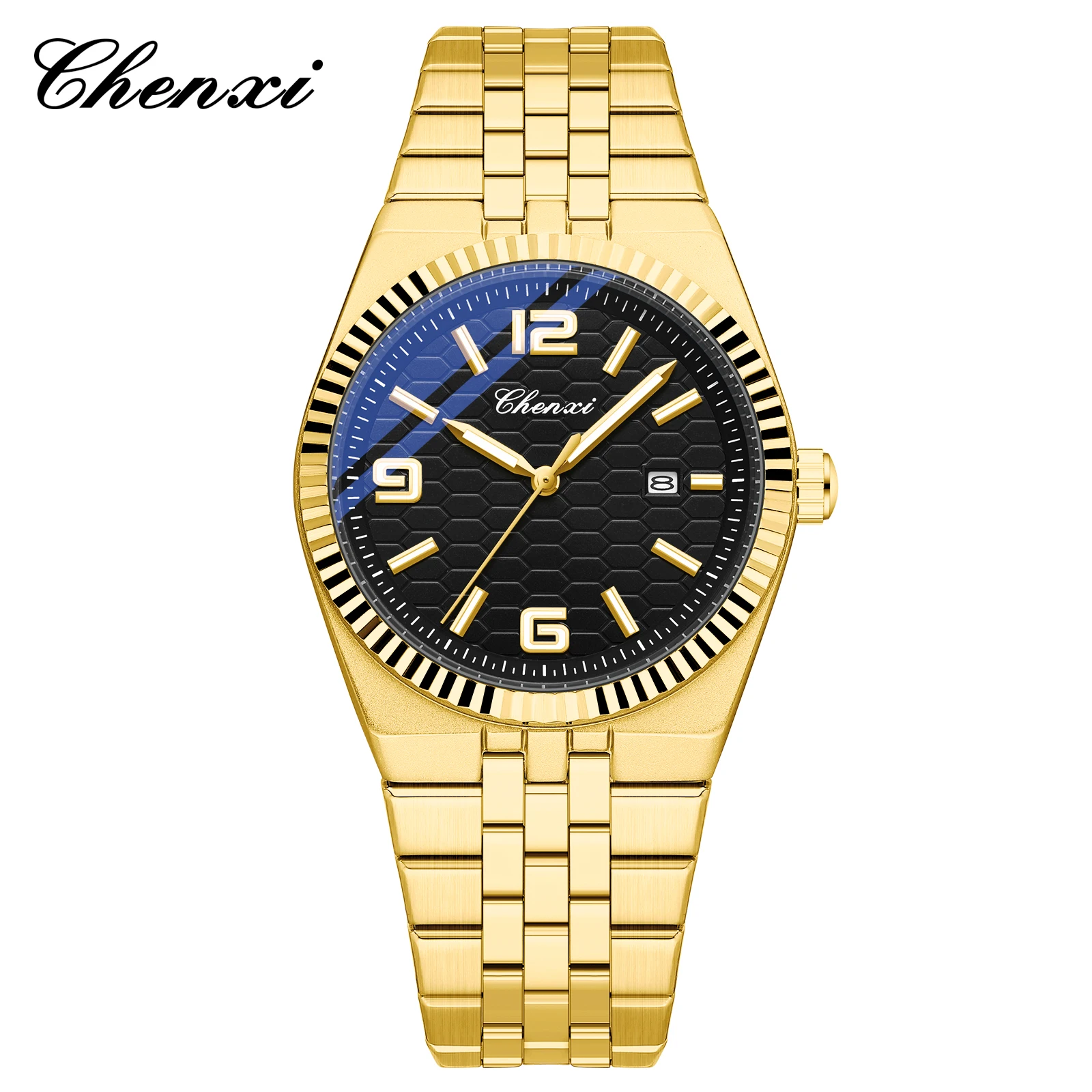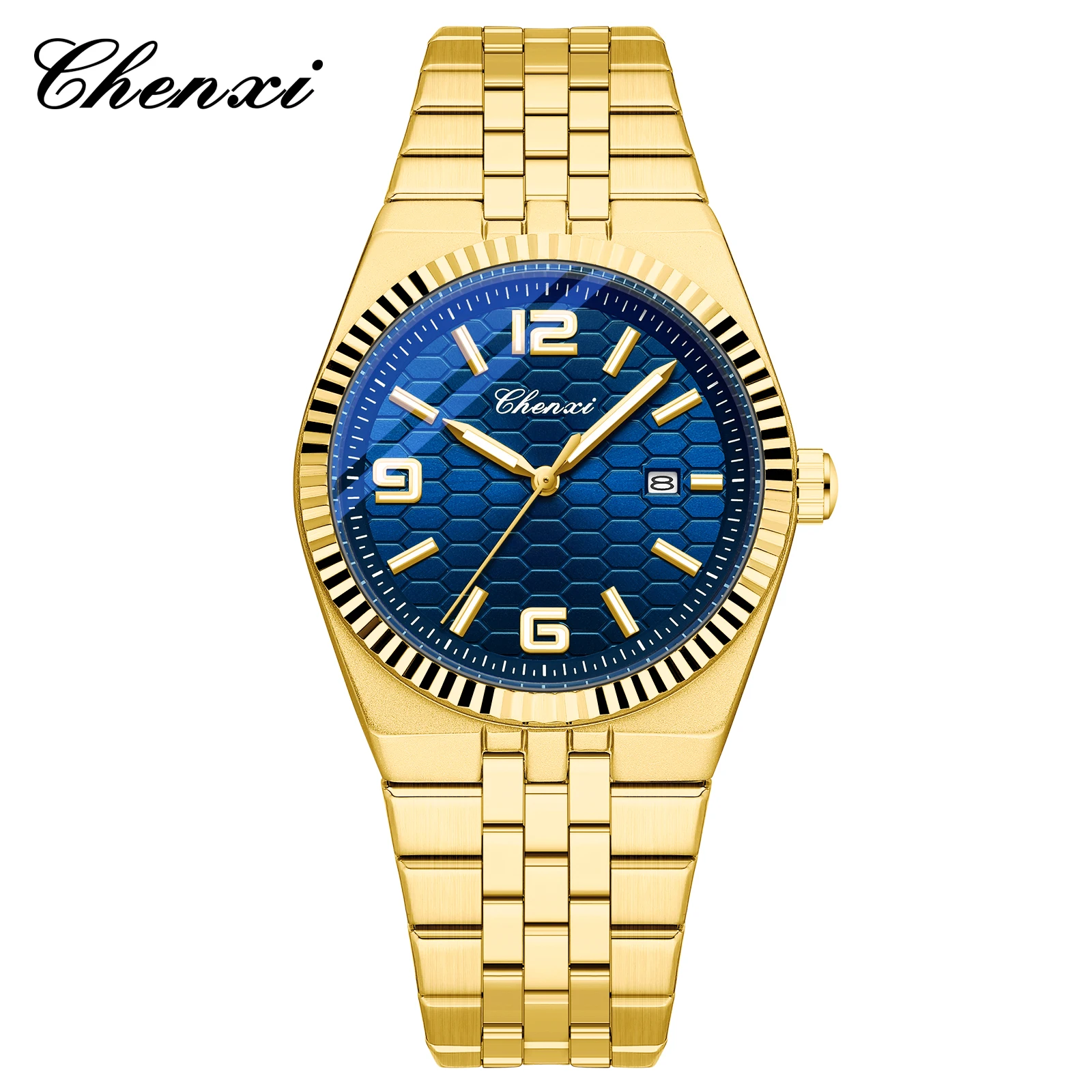 CHENXI 8280 Montres à quartz tendance pour couple, calendrier, lumineuses, bracelet en acier inoxydable doré, élégantes, montres-bracelets pour homme et femme, relógio