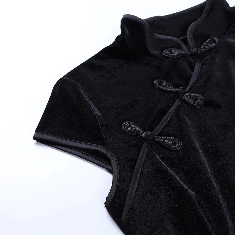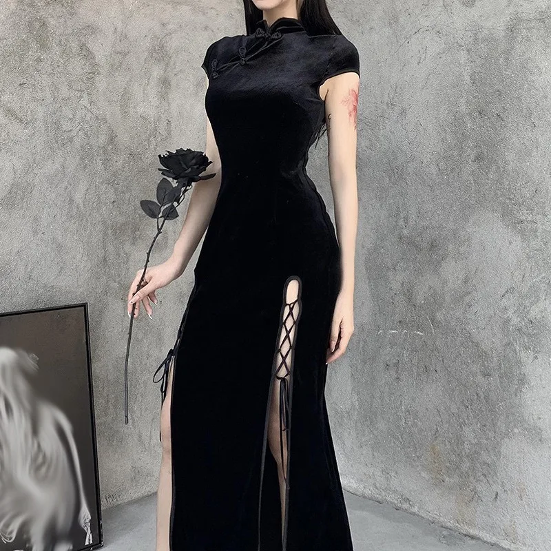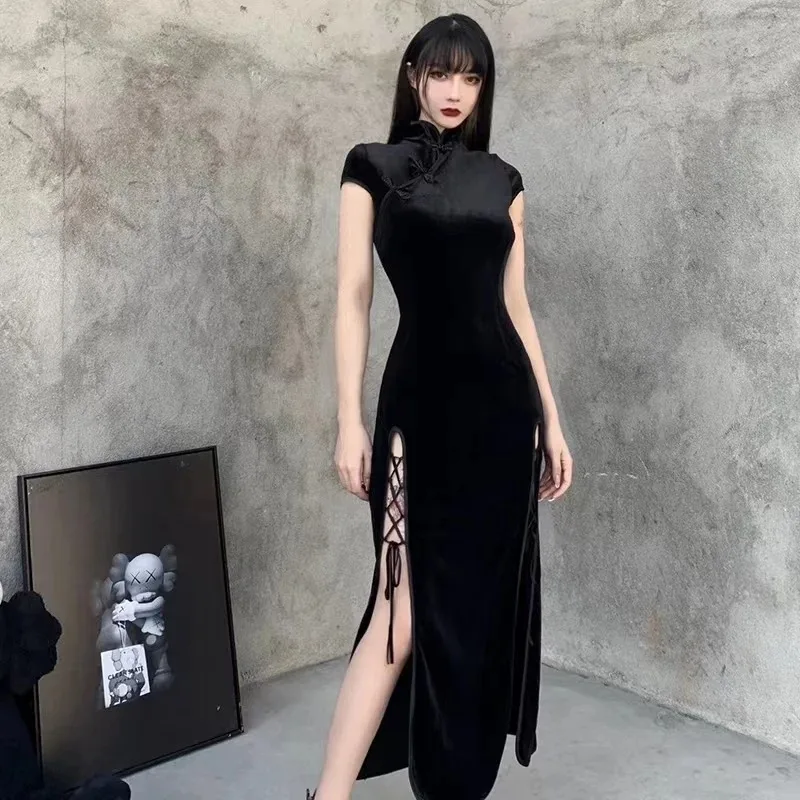 Cheongsam noir rétro chinois pour femmes, robe de soirée élégante, Qipao gothique, bandage à fente haute, robe sexy financièrement longue