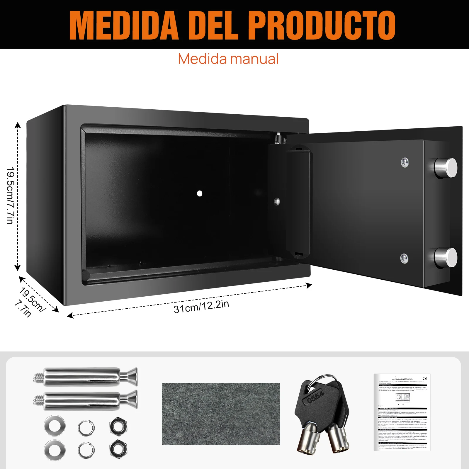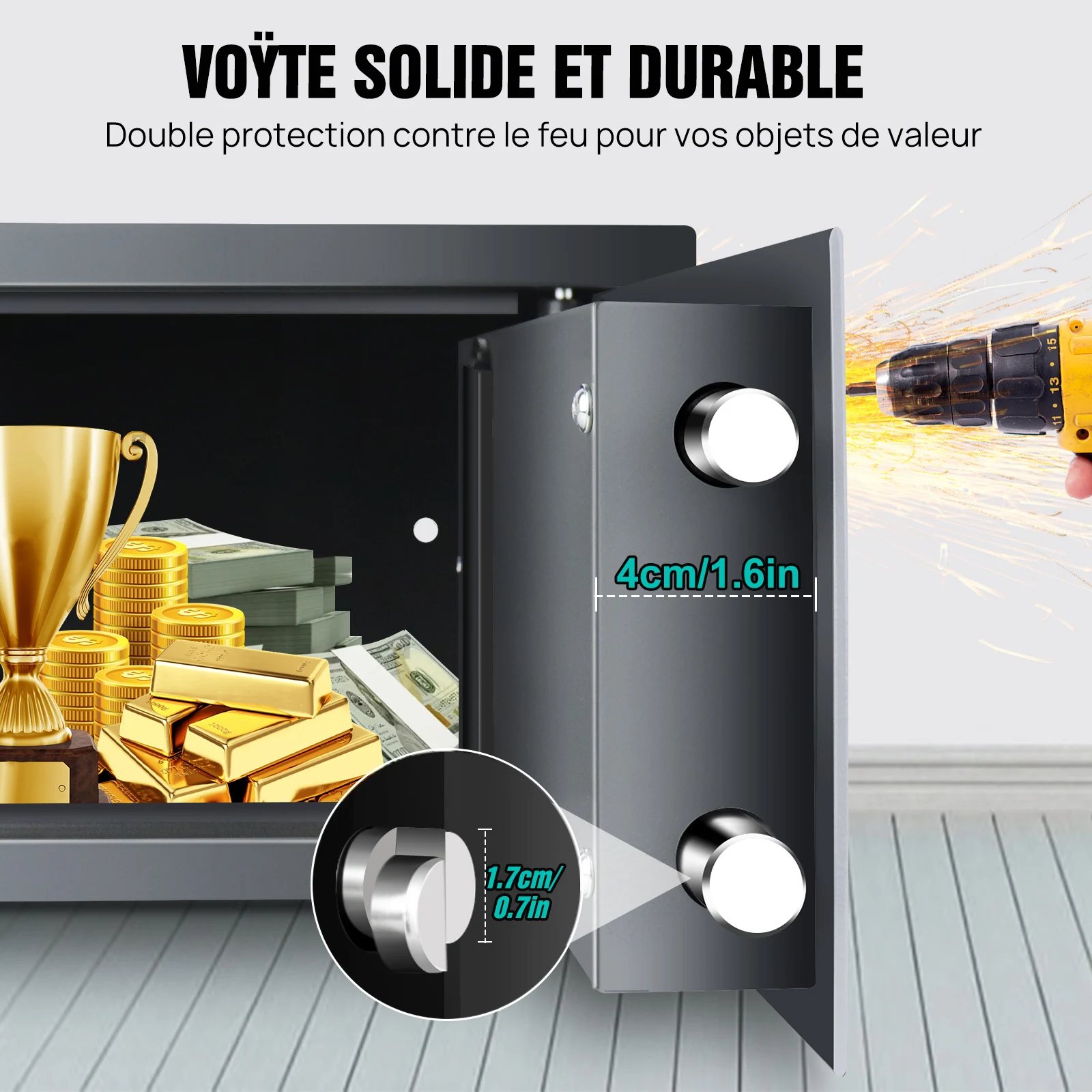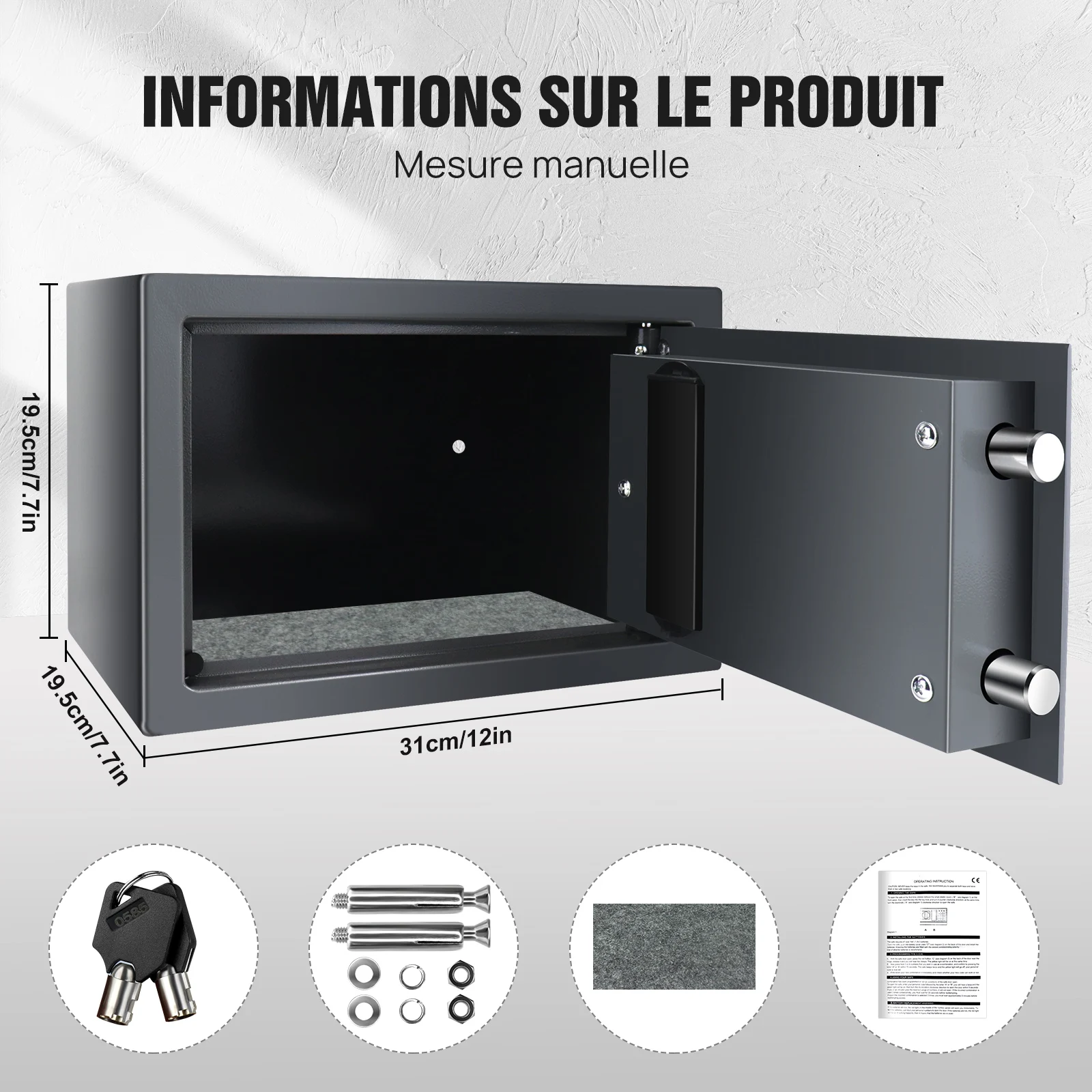 Coffre-fort numérique ignifuge multifonction : notre coffre-fort électronique est de taille modérée et extrêmement solide.Parfait pour ranger des objets de valeur comme des bijoux, des documents, des téléphones, des iPod, des photos, etc.Placez simplement les objets dans le coffre-fort et fermez la porte pour sécuriser vos biens les plus précieux.Le coffre-fort est compact et peut donc être caché à l'intérieur des placards, des armoires, etc.