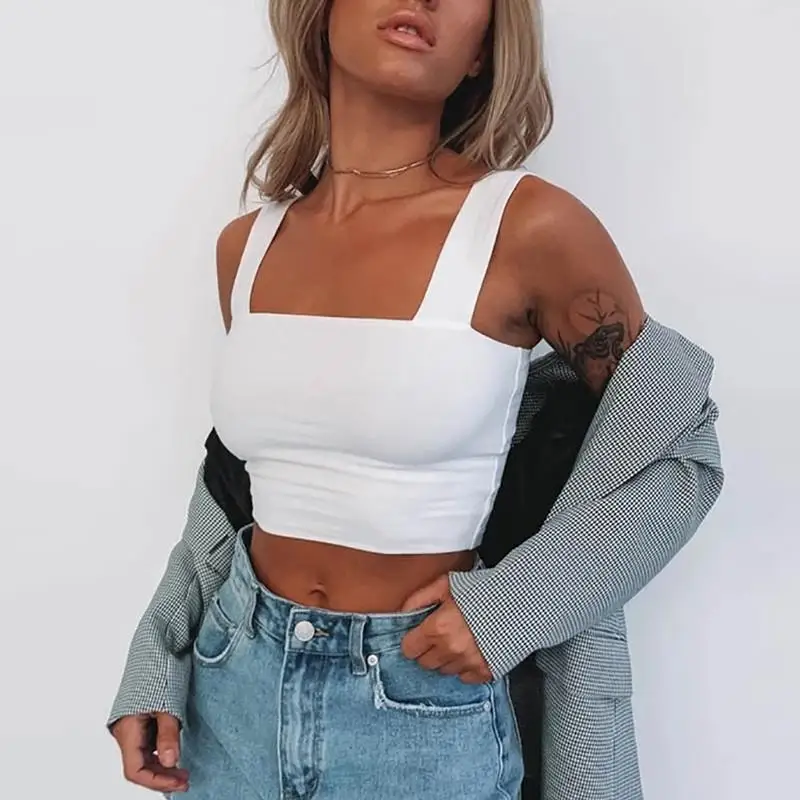 Col carré sans manches été haut court blanc femmes noir décontracté basique t-shirt épaules nues Cami Sexy dos nu débardeur