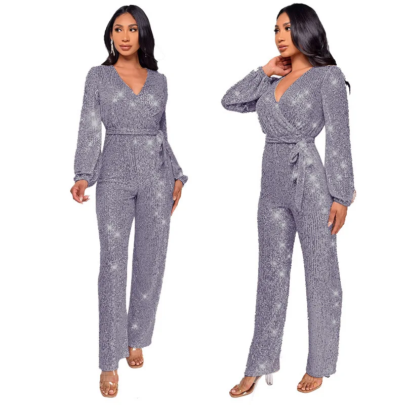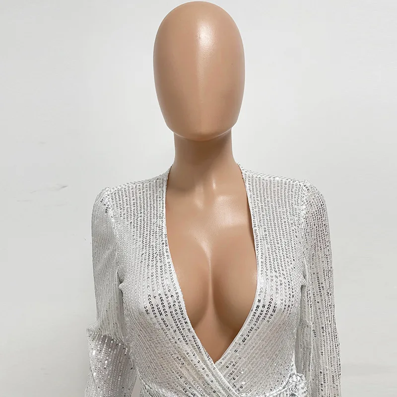 Combinaison de Club à paillettes argentées pour femmes, col en v, élégante, paillettes scintillantes dorées, barboteuse de fête