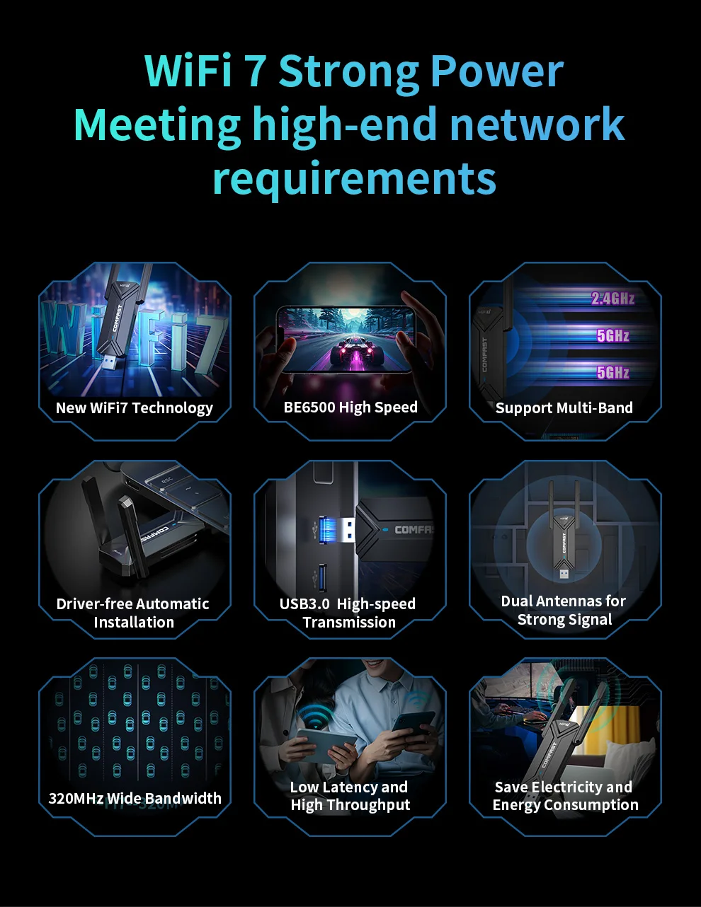 La dernière technologie WiFi de 7e génération, produit phare de la marque COMFAST, vous permet d'équiper pleinement votre carte réseau d'ordinateur portable/de bureau.