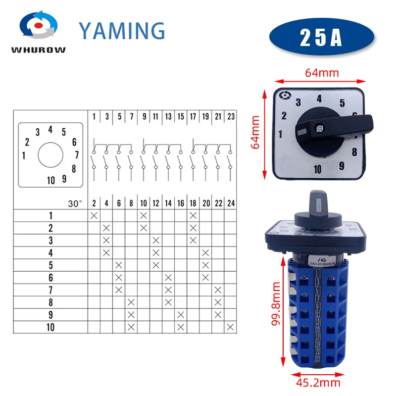 Numéro de modèle: LW26-25/6 Positions : 10 Numéro de pôle : 6 Matériel de contact : Contact argenté Tension Ui : 690 V Courant nominal : 25 A Taille du panneau: 64*64mm Taille de montage: 48*48mm Personnaliser : Assistance. Veuillez envoyer votre schéma de câblage.