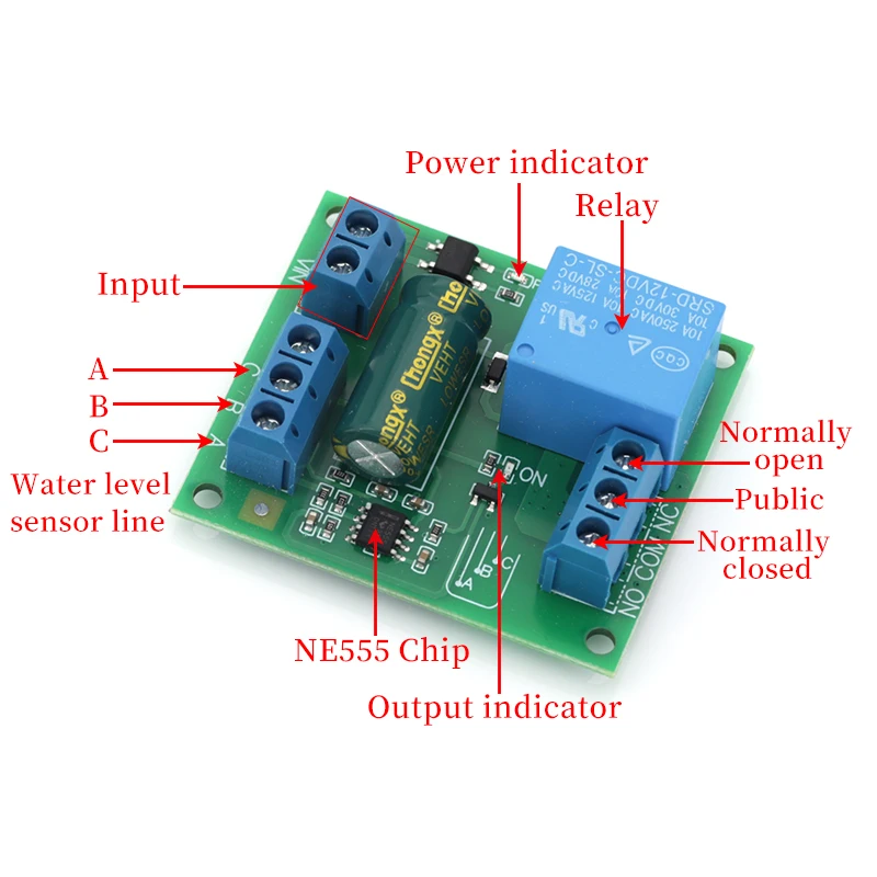 Fonction du module : pompe automatiquement de l'eau lorsque le niveau d'eau est inférieur à la sonde B ; Arrêtez de pomper lorsque le niveau d'eau atteint la sonde C.